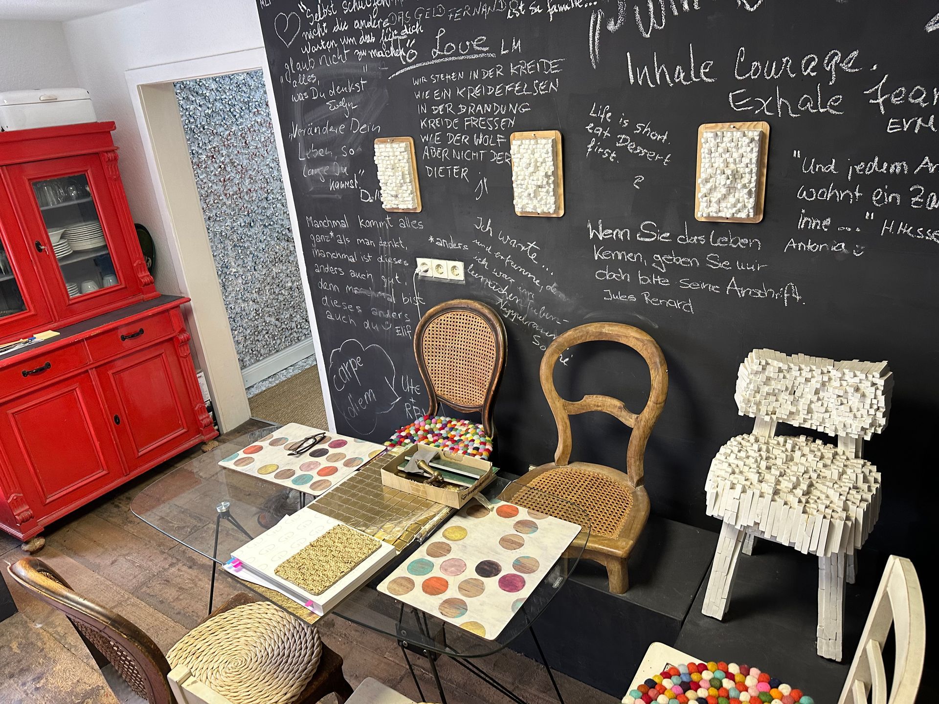 Doris, vom Kreisverband der Landfrauen in Osterode, möchte sich alternative Realitäten nicht vorstellen. „Realität ist für mich dieser Raum hier, mit seiner Dekoration aus zerdrückten Tuben“. Petra, ebenfalls von den Landfrauen, findet das Projekt spannend und faszinierend, gibt aber auch zu, mit dem Thema zu fremdeln. „Vielleicht bin ich deshalb auch erst zweimal an dem Haus vorbeigefahren“, vermutet sie.