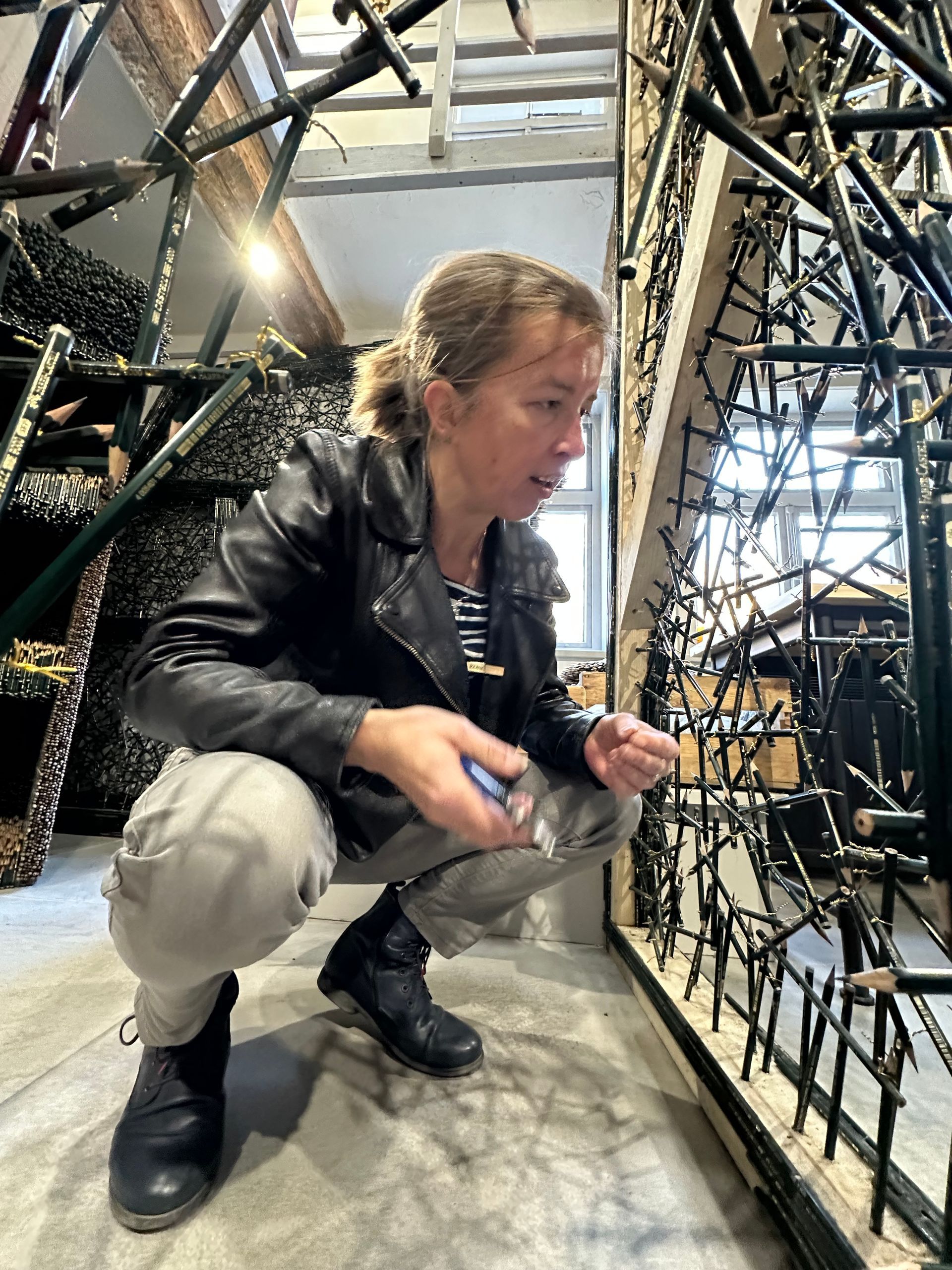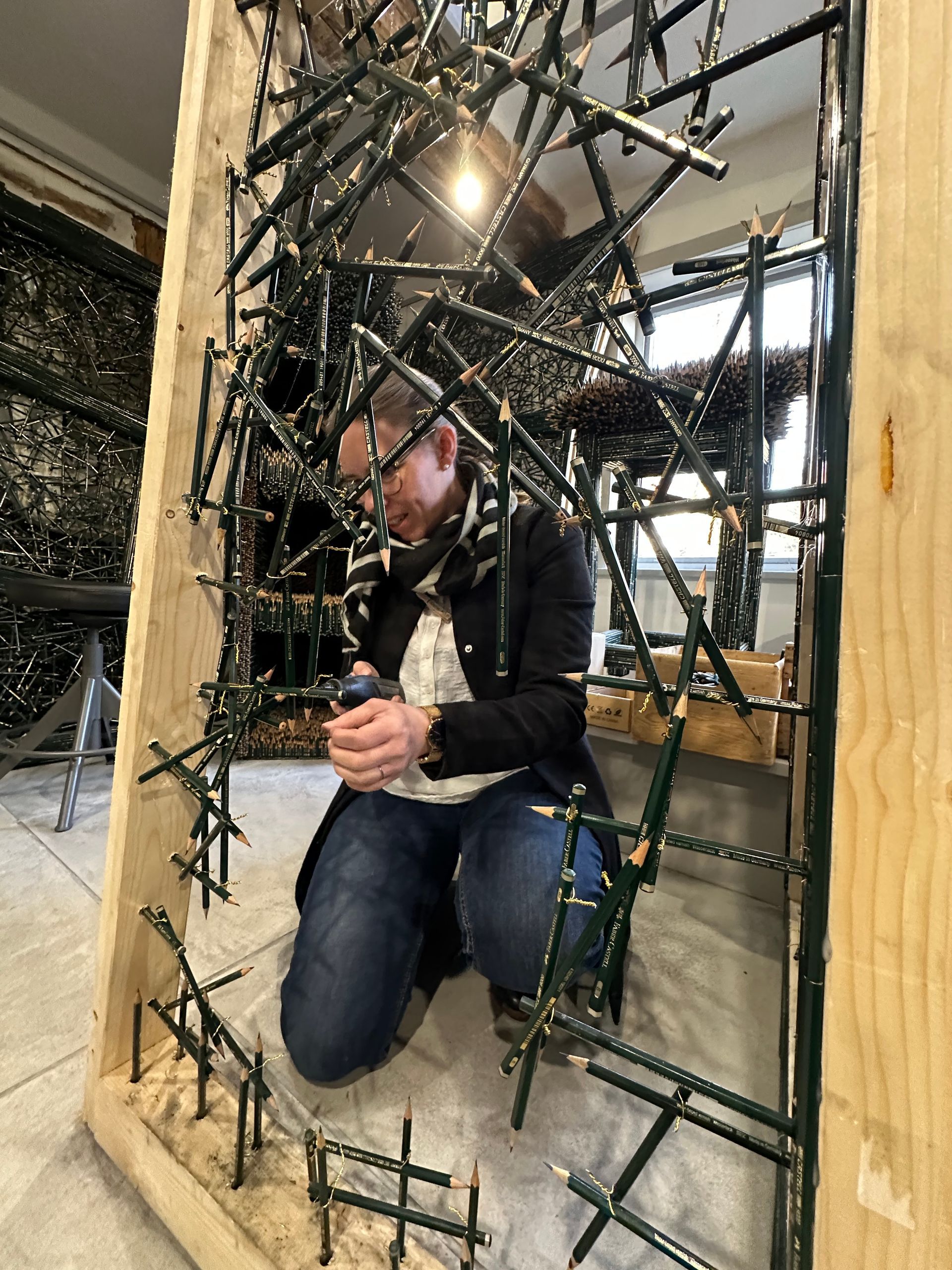 Karl, ehemaliger Forstwirt und Vorsitzender der regionalen Jägerschaft, zeigt sich mit virtuellen Verfahren vertraut: „das kenne ich aus der Forstwirtschaft, da lernen wir die Veränderungen im Wald zu simulieren, bevor beispielsweise ein Baum gefällt wird“. Er könne sich daher gut vorstellen, dass es zu einem fließenden Übergang von der physischen Realität zur virtuellen komme, weil die VR bei der Ausbildung eine große Hilfe sei. Auch Verena, Leiterin des Fachbereichs Bauen der Stadt Osterode, hat als Architektin Erfahrung mit Simulationen. Bei der Frage nach der Realität möchte sie allerdings auf der gebauten Wirklichkeit beharren. Die Stadt habe das Projekt ja sehr unterstützt, das war ja etwas ganz Neues: Bleistifthaus? Schwarmkunst?? Umso mehr zeigt sie sich jetzt „total begeistert“, es sei eine „richtig gute Idee, alltägliche Dinge wie Bleistifte in Kunst umzuwandeln“.