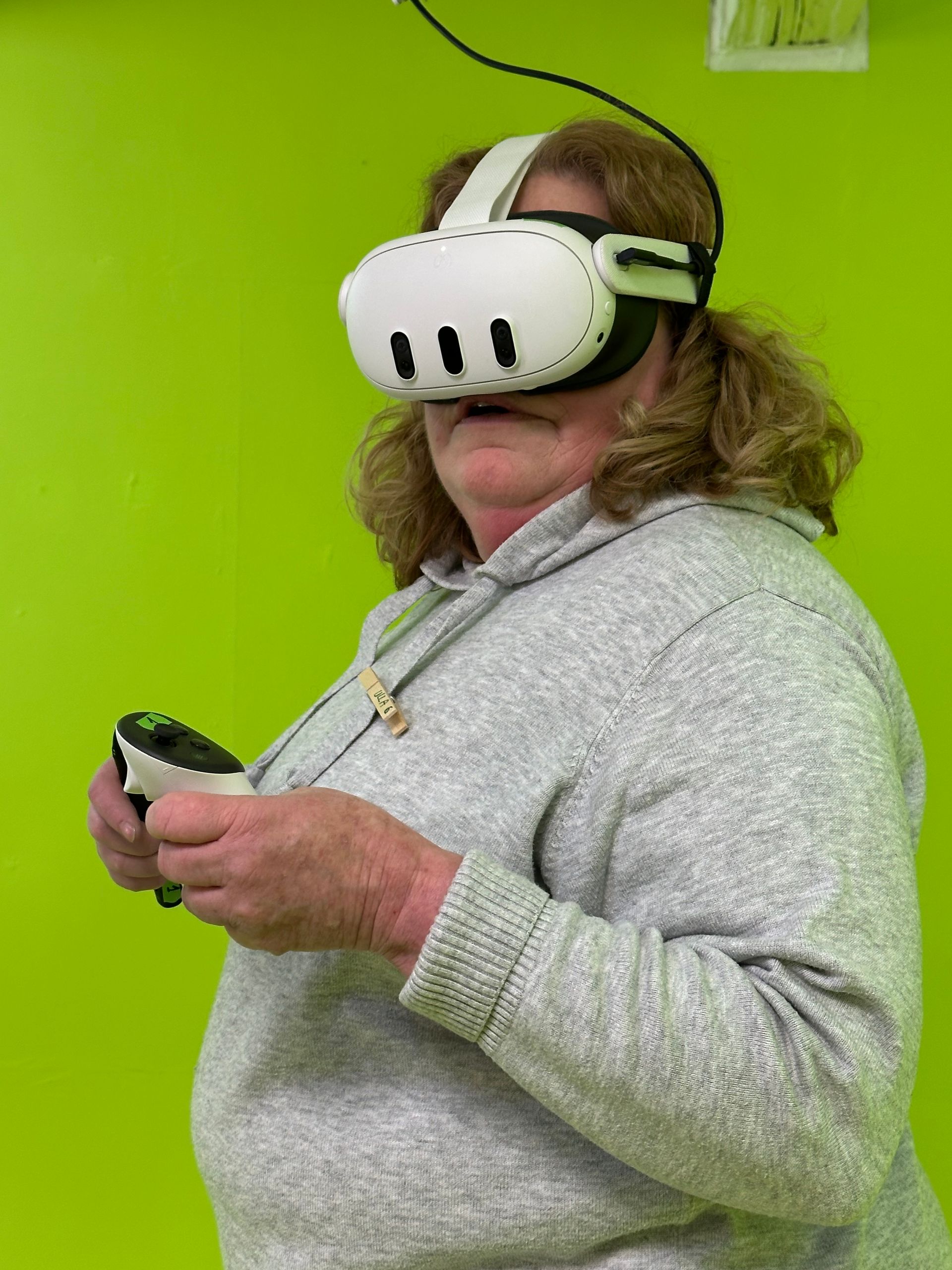 Für Ulla war es an diesem Tag der erste Ausflug in die virtuelle Welt und der führte sie gleich hoch hinaus: „Als ich dann plötzlich vor einem (virtuellen) Abgrund stand, wurde mir schwindelig und ich musste die Brille kurz absetzen“. Die Verunsicherung währte allerdings nicht lange und sie stürzte sich wieder ins Abenteuer. „Ein irres Gefühl“, sagte sie, aber vielleicht falle es einem mit etwas mehr Erfahrung dann noch leichter.