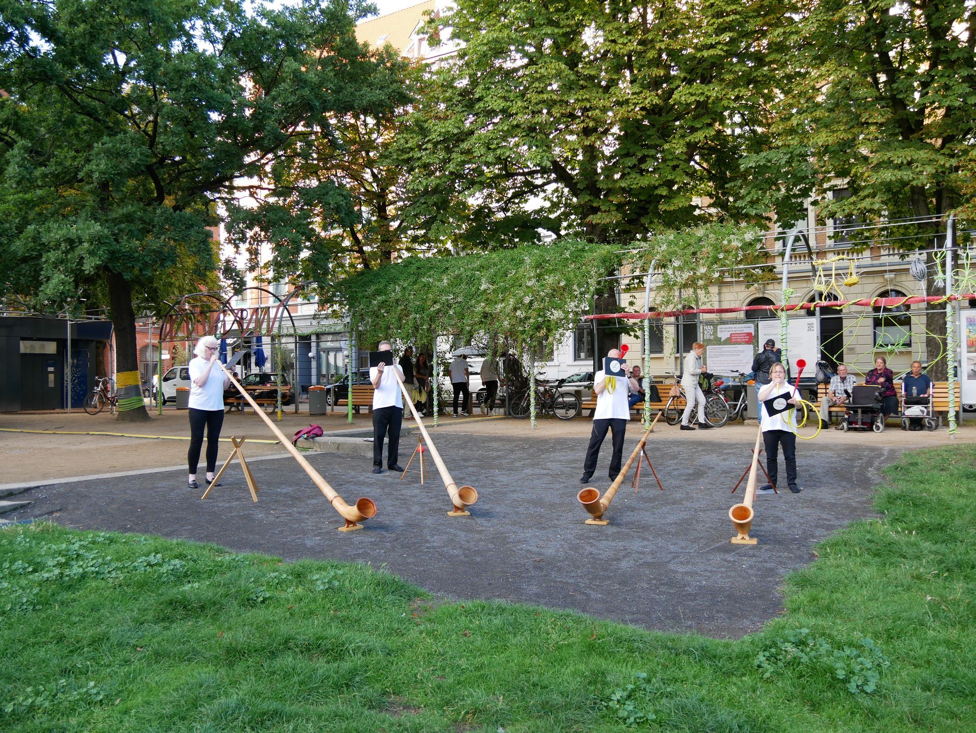 Nicht weniger hoch hinaus wiesen die Bläser von Alpha mit ihren Alphörnern und dem Schlauchophon. Letzteres heißt vielleicht auch ganz anders, sieht jedenfalls aus wie eine Mischung aus Jagdhorn und Dudelsack, der Korpus besteht aus einem Schlauch. „Das passte einfach zu gut“, fand Stephanie Schünemann vom Kulturamt der Stadt, die das Quartett auf dem Lindener Berg beim Scilla-Festival entdeckte.