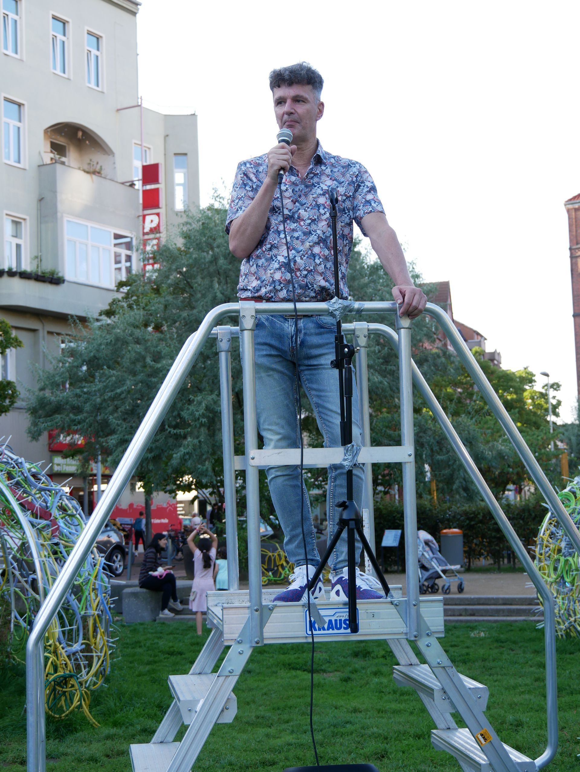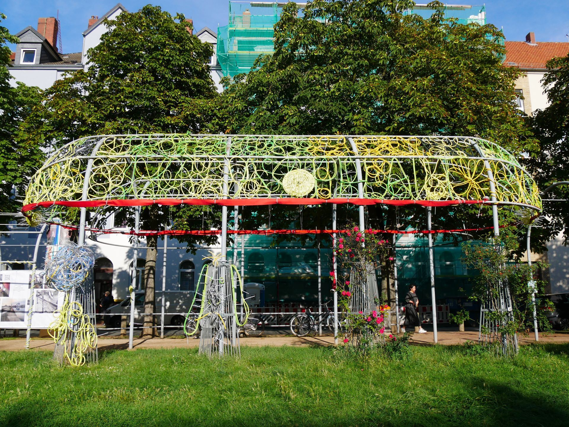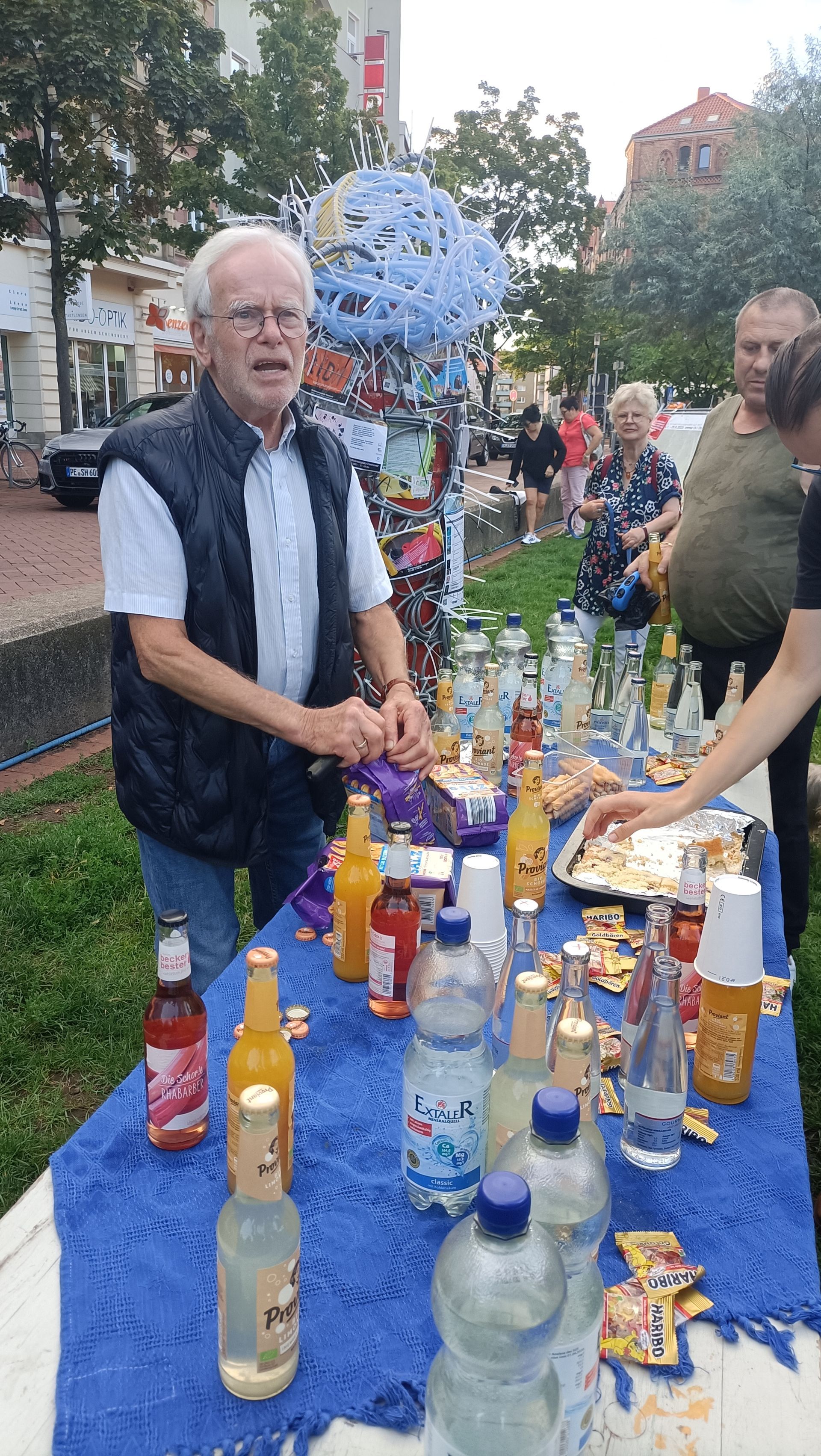 Konstanze Beckedorf hatte zuvor in ihrer Rede auch an das besondere Umfeld der bahnhofsnahen Plätze erinnert, das vom Projekt nicht ausgeblendet, sondern bewusst thematisiert wurde: wie können wir den öffentlichen Raum zum Nutzen aller erhalten? Der Erfolg des Projekts sei an jedem Tag sichtbar gewesen, die vielen Menschen, die hier zu Künstlern wurden, die vielen Gespräche, aber auch die vielen Kinder, die man auf diesem Platz so zahlreich wohl noch nie zuvor gesehen hat. Und das alles sei der Künstlerin Kerstin Schulz und ihrem Team zu verdanken und dafür gab es dann auch noch eine Sonnenblume und viel Süßes.