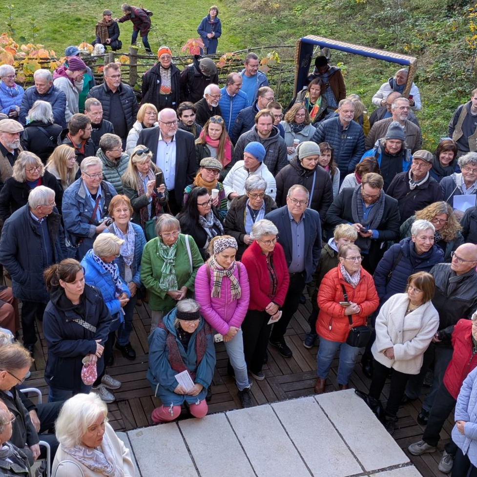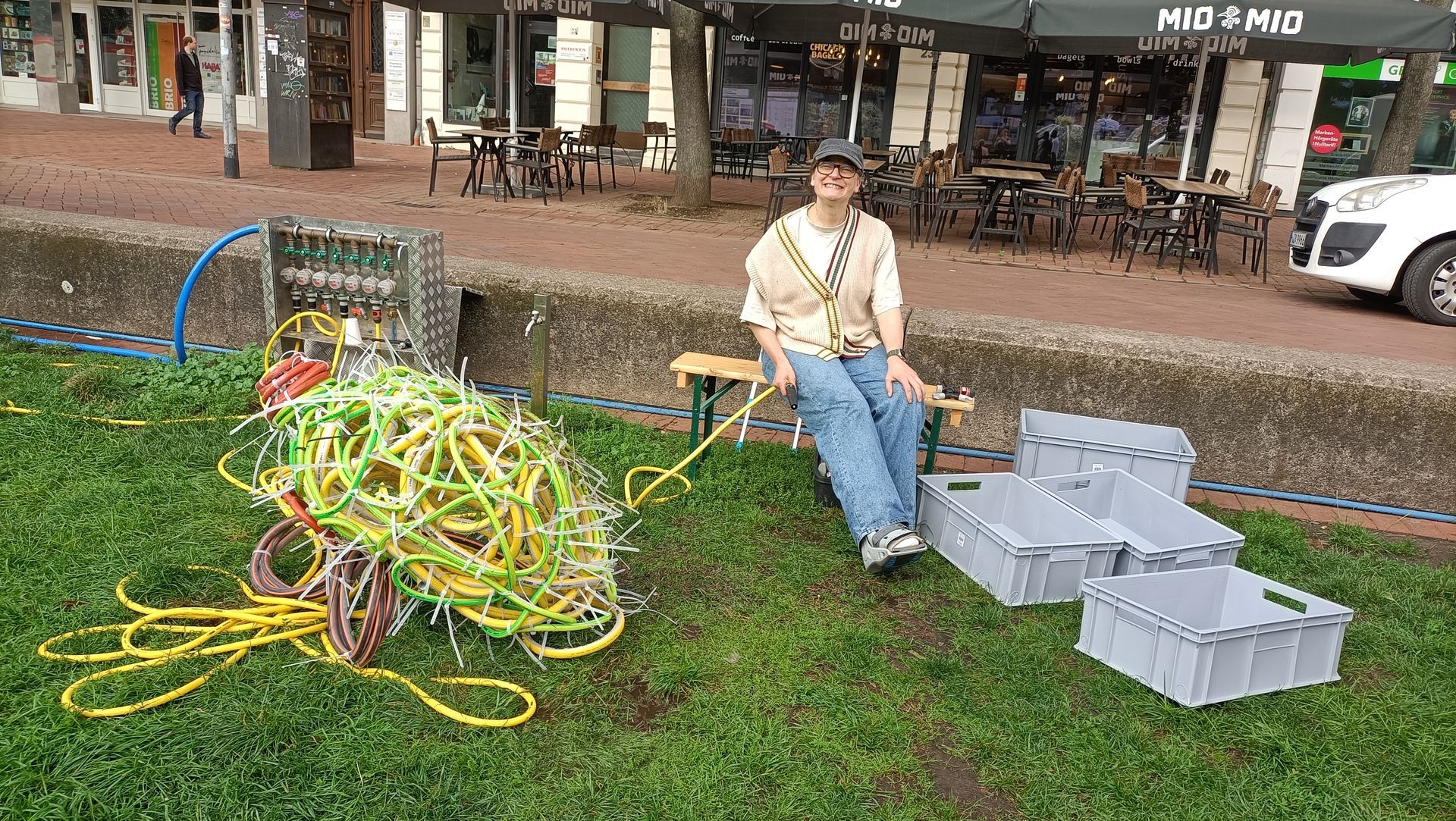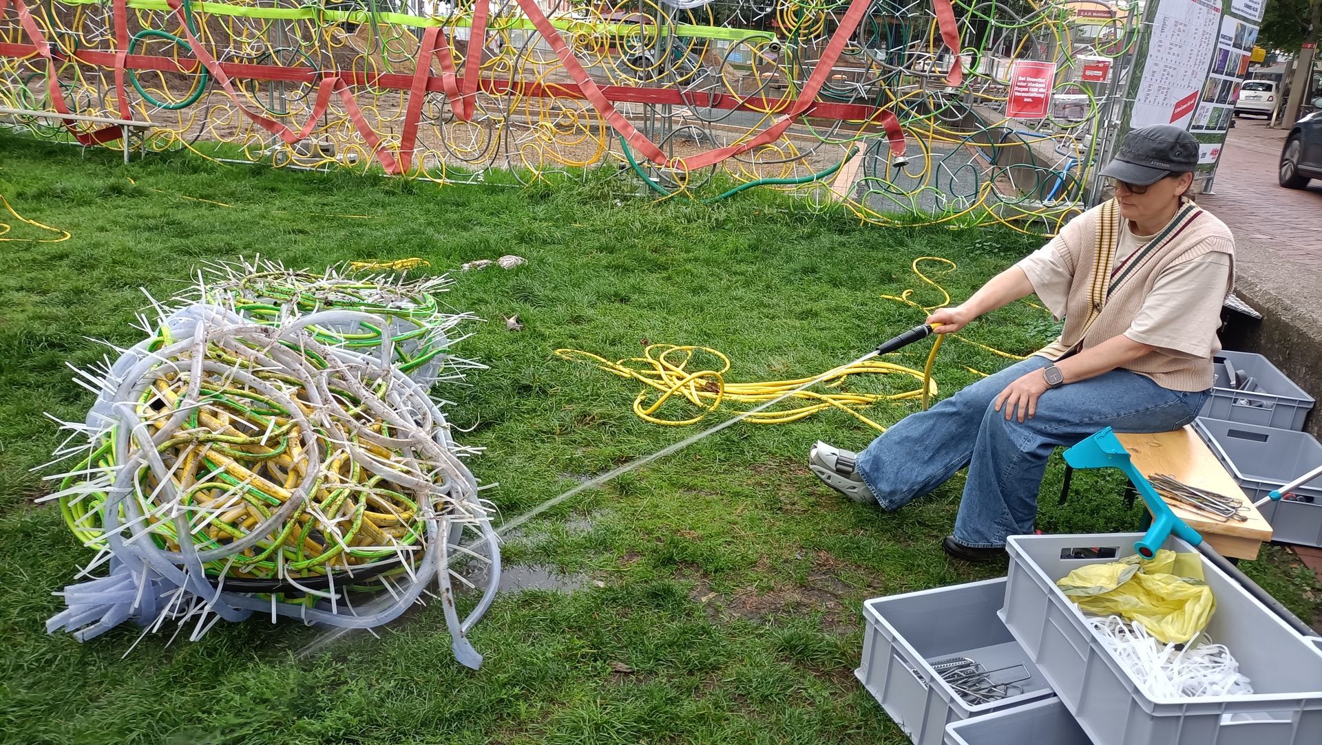 Einen „Unort“ möchte Familie Reinhardt bei „Lerbach leuchtet“ bespielen, einen Ort, der meist unbeachtet ist, der aber einlädt zum Innehalten und zum Hinhören, um die Geräusche des Wassers wahrzunehmen. In Gestalt von Mutter Angelika, Tochter Anna und Sohn Nick haben sie mit Begeisterung die Geräusche und Bewegungen des Wassers mit in Kreisen verschlungenen Wasserschläuchen eingefangen und in Linie transformiert. Wasserschläuche, die aus der Skulptur wieder ins Wasser hineinragen, als ob das Wasser aus ihnen wieder herausflösse. „Rausch“, so müsste die Installation heißen, meinte Nick. Und Angelika berichtet von den unterschiedlichen Geräuschen, die das Wasser macht, je nachdem, wo und wann man sich am Bach in Lerbach befindet. „Mal hört man ihn gar nicht, weil er unterirdisch verläuft, mal gluckst, sprudelt oder plätschert er, mal strömt er, mal rauscht er gar“, berichtet die Kunstlehrerin. Mit diesen Geräuschen sei sie aufgewachsen und darauf habe sie auch ihre Kinder immer wieder aufmerksam gemacht. Die Kindheit sei kein Zeitraum, bemerkte Jacques Brel einmal, sondern ein Ort. Mitunter auch ein Ort, der gluckst und sprudelt und rauscht. Man muss nur hinhören.