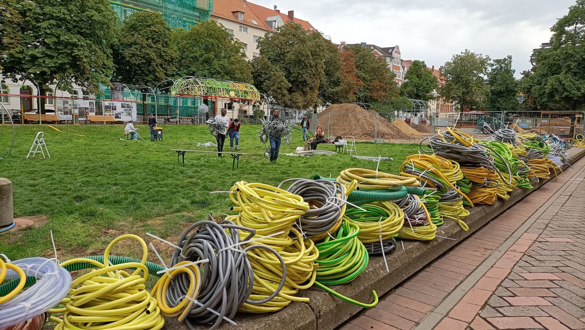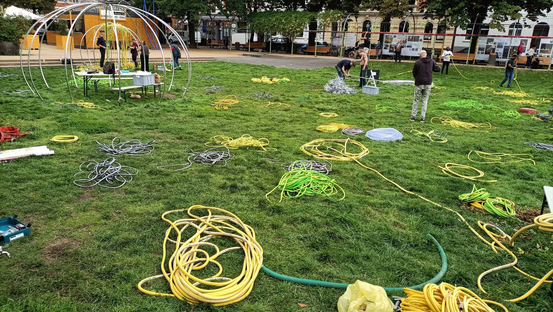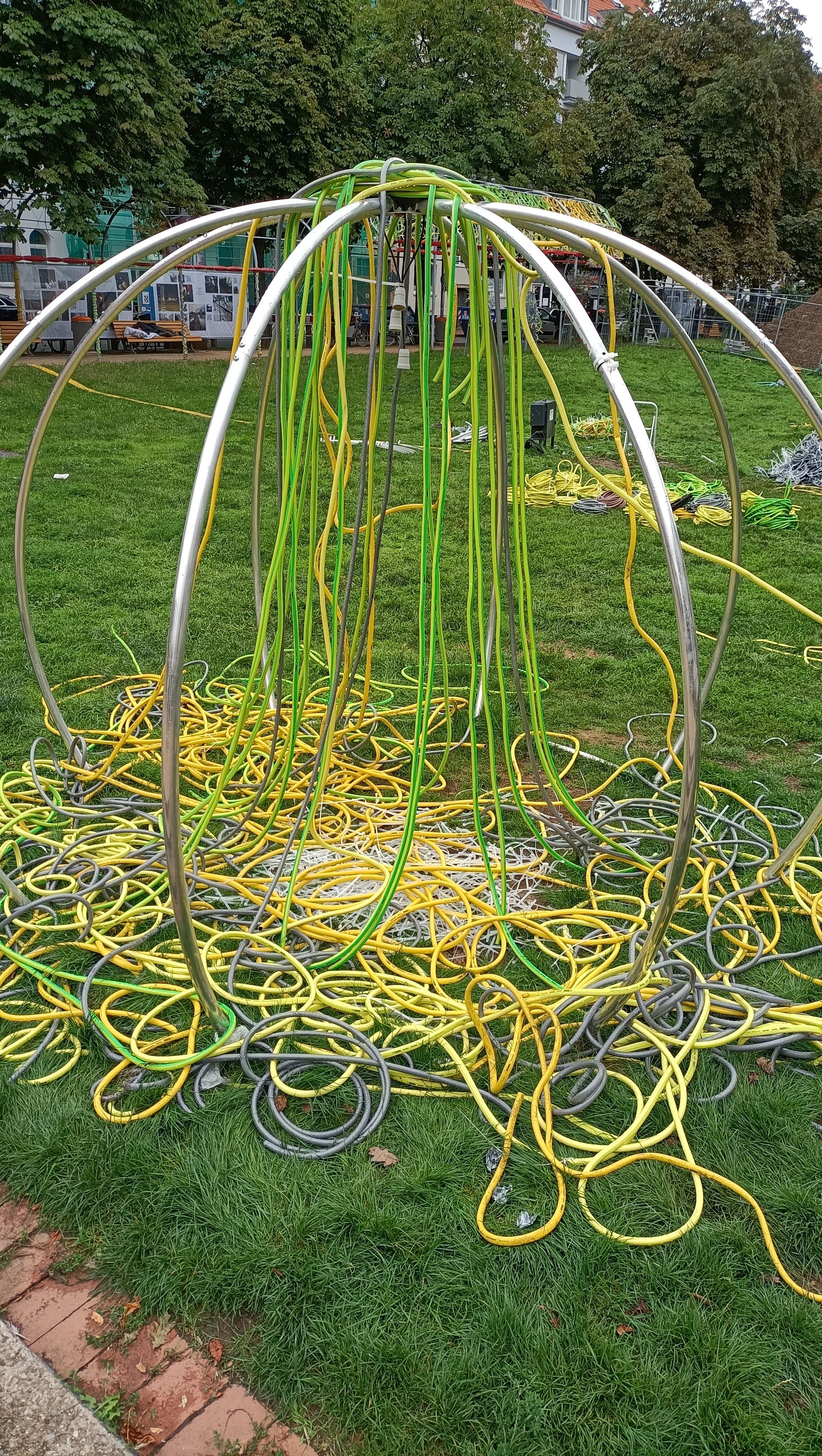 Eine Hommage an das Schwarmkunstereignis 2023 auf dem Weißekreuzplatz in Hannover und zugleich eine Ode an das vergangene Werk, an das menschliche Miteinander und das Miteinander von ungleichen Materialien und Formen. Entstanden durch die Hände vieler, und doch durch den kreativen Akt eines Einzelnen geprägt. Bei Nacht verwandelt sich das Zelt, wenn die Umgebung in die Dunkelheit zurückgetreten ist. Es wird zum Leuchtturm der Farben, ein pulsierendes Spiel aus Licht und Bewegung. Lange, geschwungene Linien, wie der Lerbach selbst, tanzen von der Kuppel zum Boden und ergießen sich über die Wiese. Das Licht im Dunkeln wird zum kreativen Impuls, zum Anstoß, die eigene Vorstellungskraft zu beflügeln. Hier trifft man nicht nur auf Freunde, sondern vielleicht auch auf Fremde, die sich im Rahmen einer Schwarmkunstaktion miteinander verbinden und so zu neuen Verbindungen und gemeinsamer Kreativität finden. Dieses Werk ist ein lebendiges, sich ständig veränderndes Experiment, das den Dialog mit dem Publikum sucht und Platz für neue Ideen und Interpretationen lässt. Es lädt ein, Normen zu hinterfragen, umzudenken und das Unbekannte zu umarmen. Ein Ort der Begegnung – sowohl mit anderen als auch mit der eigenen Fantasie.