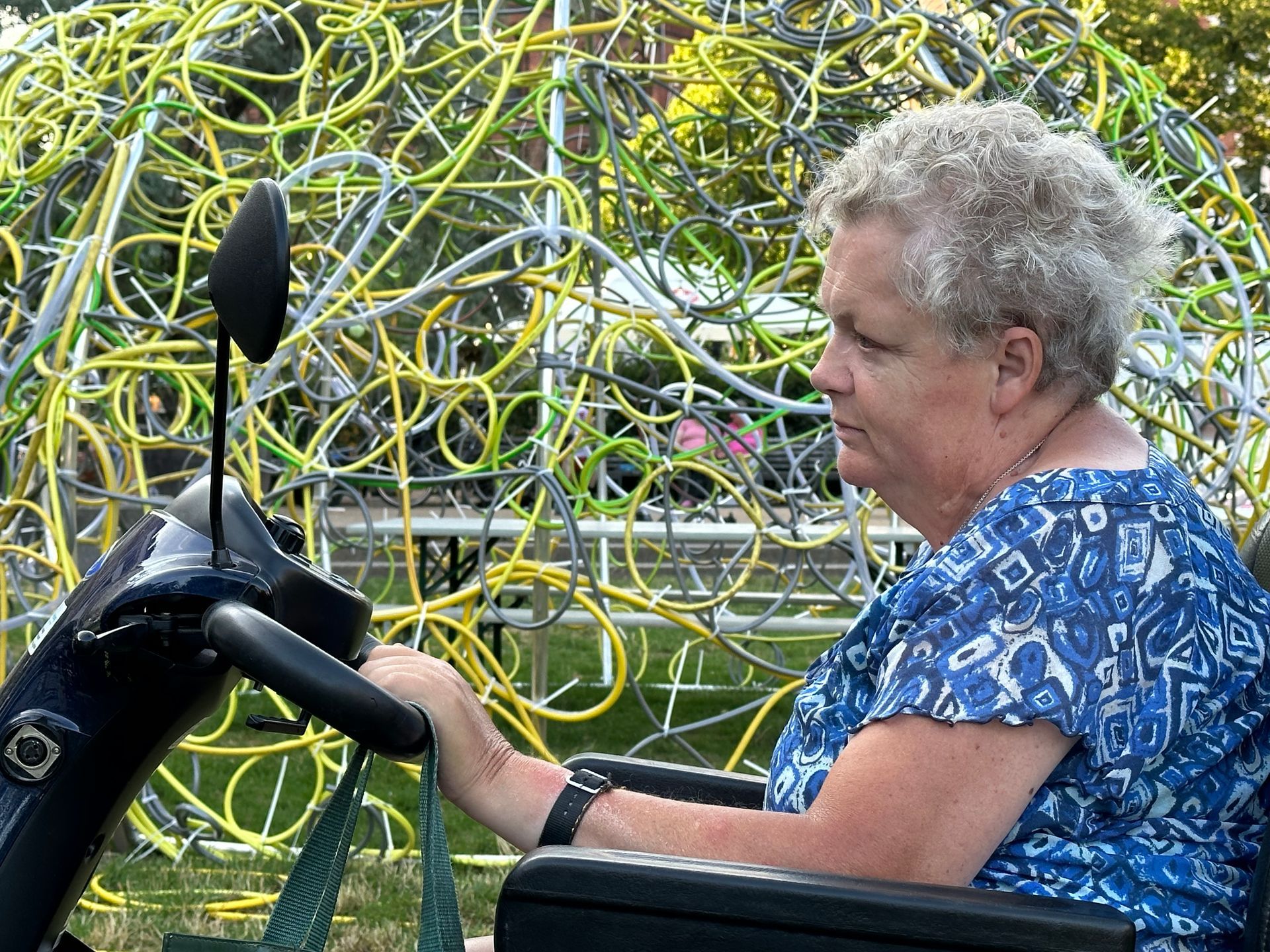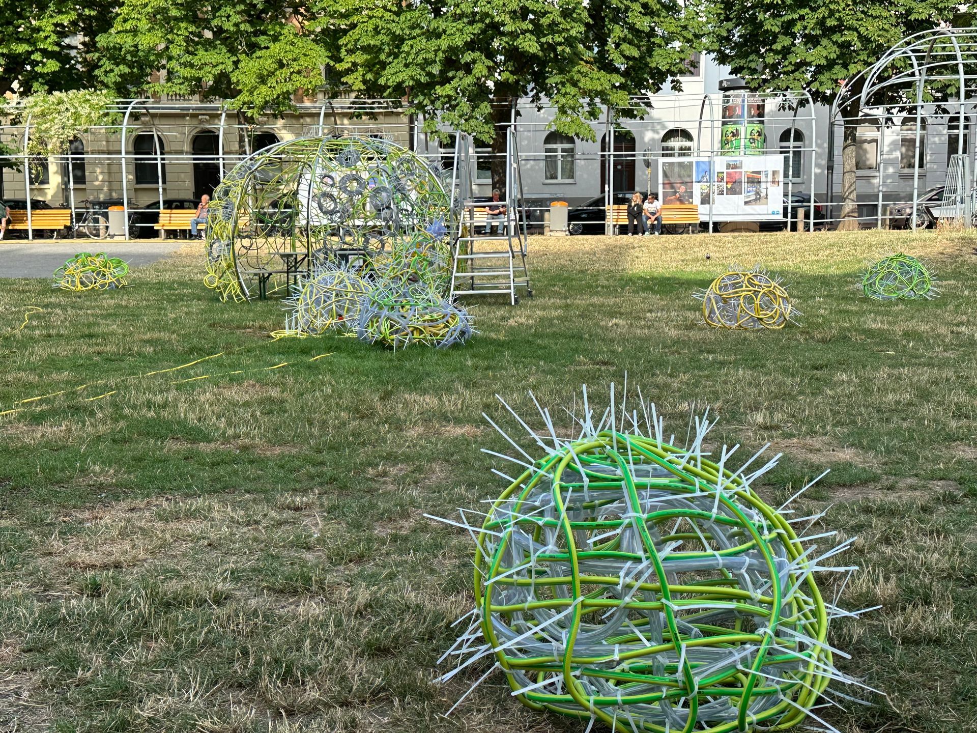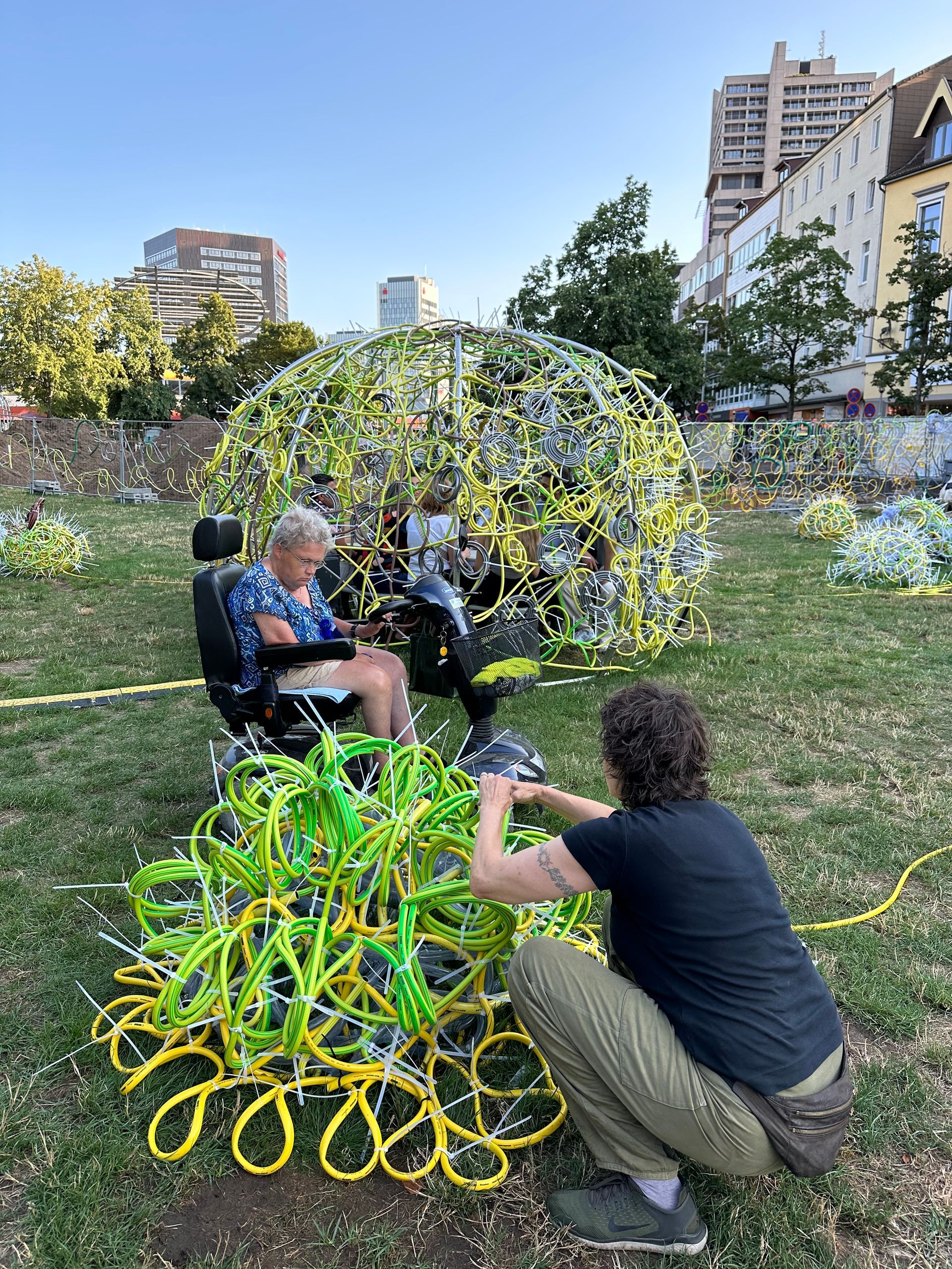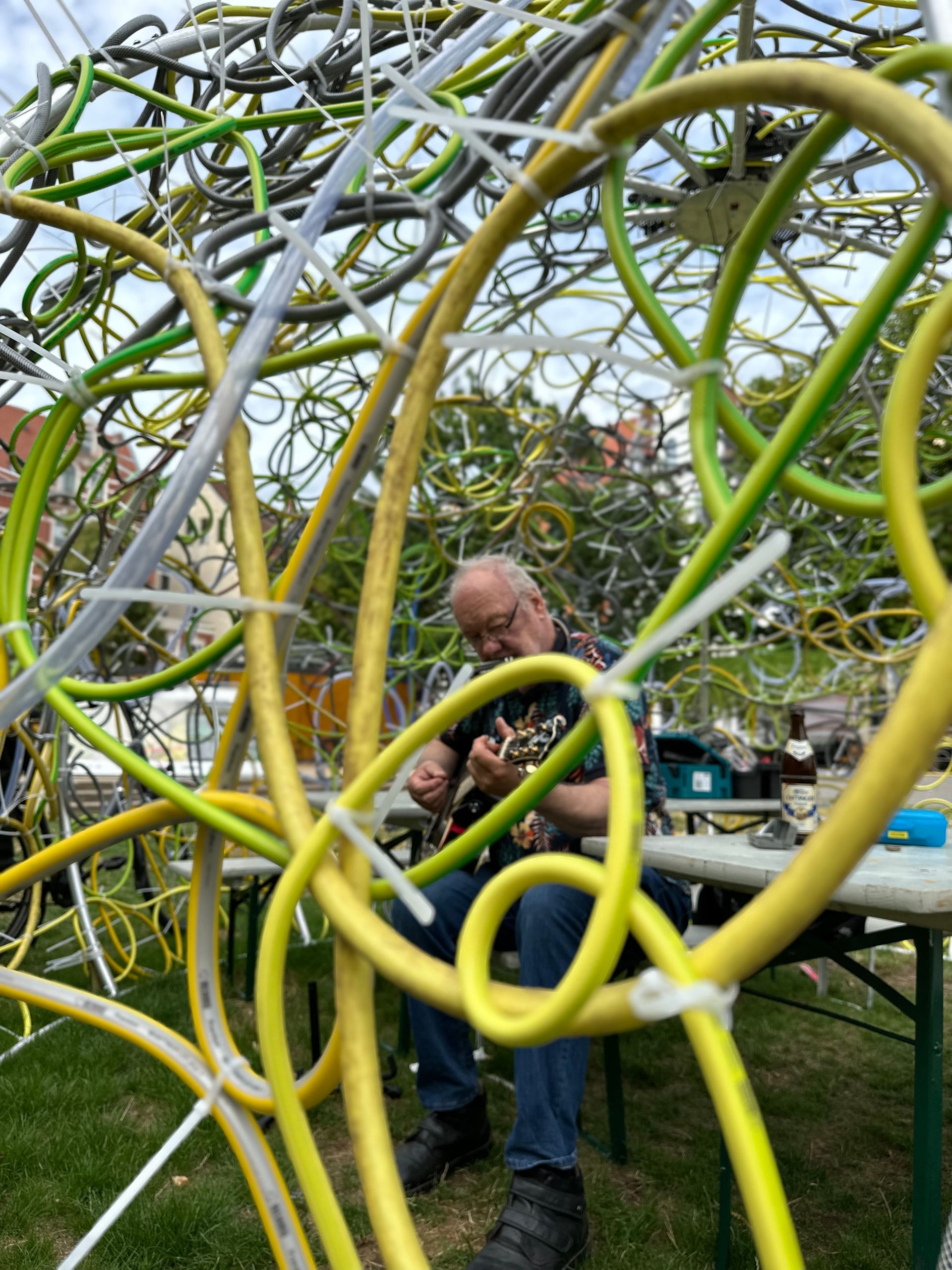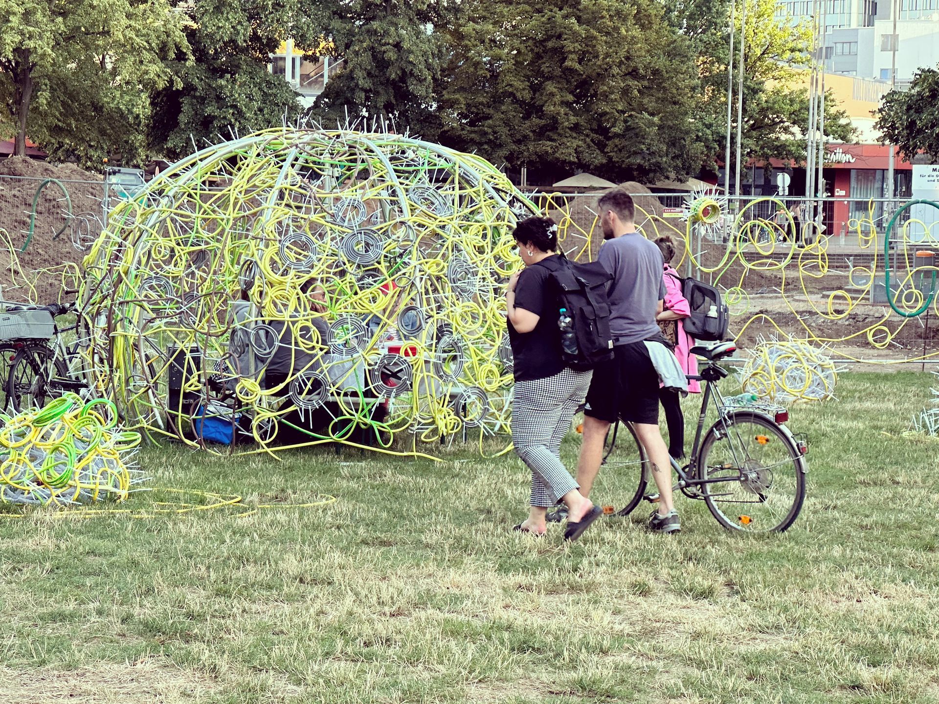 Eine Hommage an das Schwarmkunstereignis 2023 auf dem Weißekreuzplatz in Hannover und zugleich eine Ode an das vergangene Werk, an das menschliche Miteinander und das Miteinander von ungleichen Materialien und Formen. Entstanden durch die Hände vieler, und doch durch den kreativen Akt eines Einzelnen geprägt. Bei Nacht verwandelt sich das Zelt, wenn die Umgebung in die Dunkelheit zurückgetreten ist. Es wird zum Leuchtturm der Farben, ein pulsierendes Spiel aus Licht und Bewegung. Lange, geschwungene Linien, wie der Lerbach selbst, tanzen von der Kuppel zum Boden und ergießen sich über die Wiese. Das Licht im Dunkeln wird zum kreativen Impuls, zum Anstoß, die eigene Vorstellungskraft zu beflügeln. Hier trifft man nicht nur auf Freunde, sondern vielleicht auch auf Fremde, die sich im Rahmen einer Schwarmkunstaktion miteinander verbinden und so zu neuen Verbindungen und gemeinsamer Kreativität finden. Dieses Werk ist ein lebendiges, sich ständig veränderndes Experiment, das den Dialog mit dem Publikum sucht und Platz für neue Ideen und Interpretationen lässt. Es lädt ein, Normen zu hinterfragen, umzudenken und das Unbekannte zu umarmen. Ein Ort der Begegnung – sowohl mit anderen als auch mit der eigenen Fantasie.