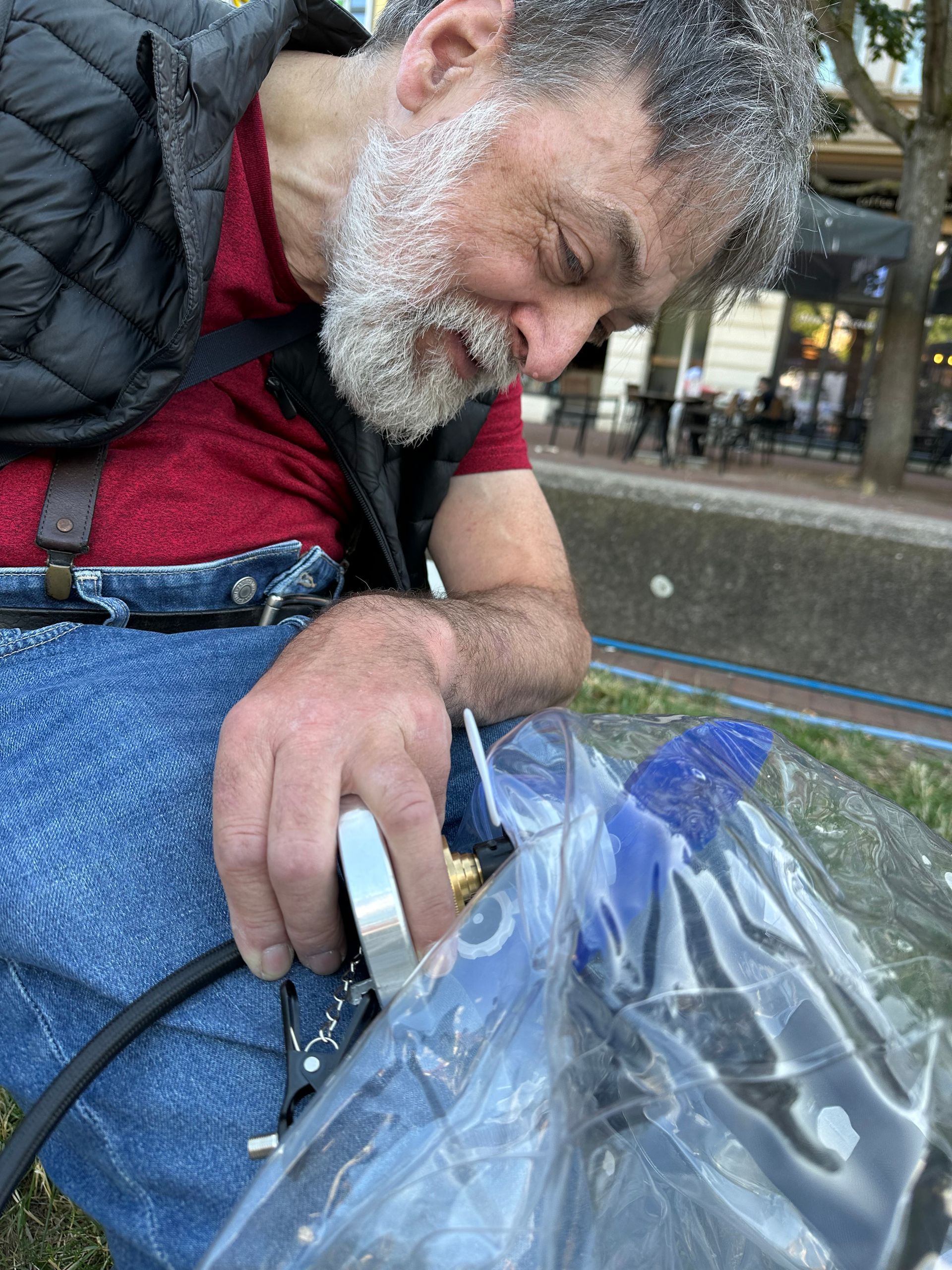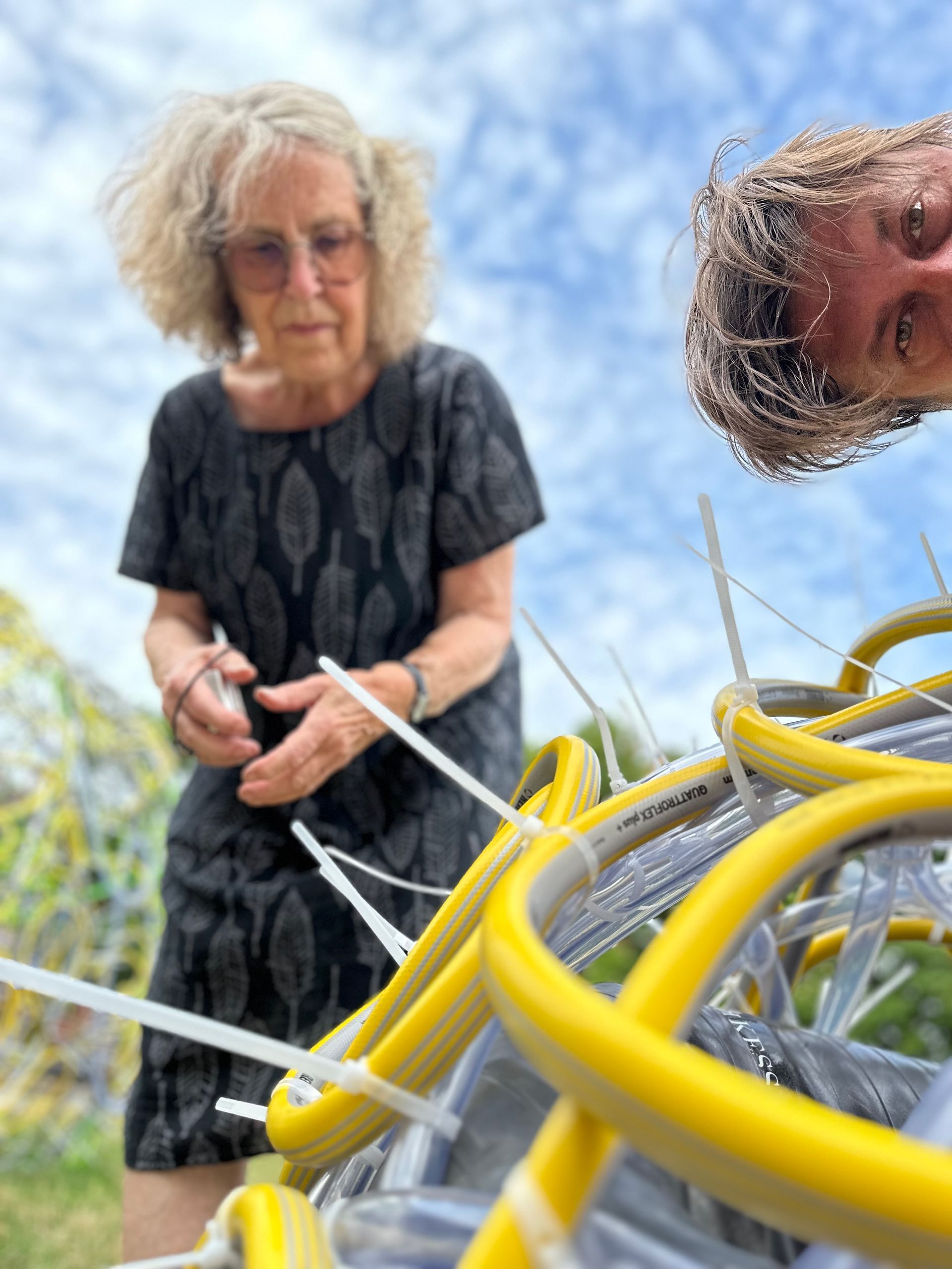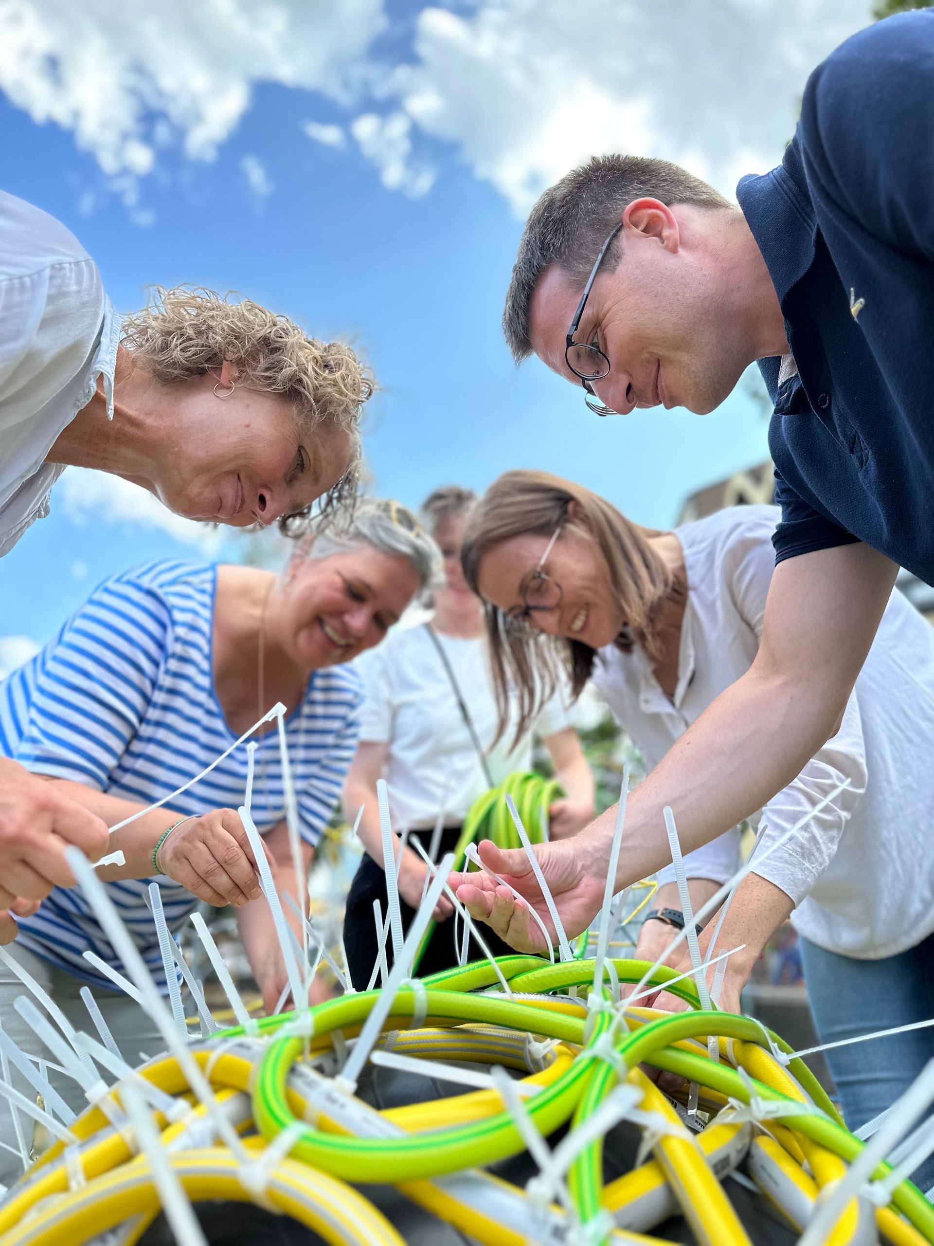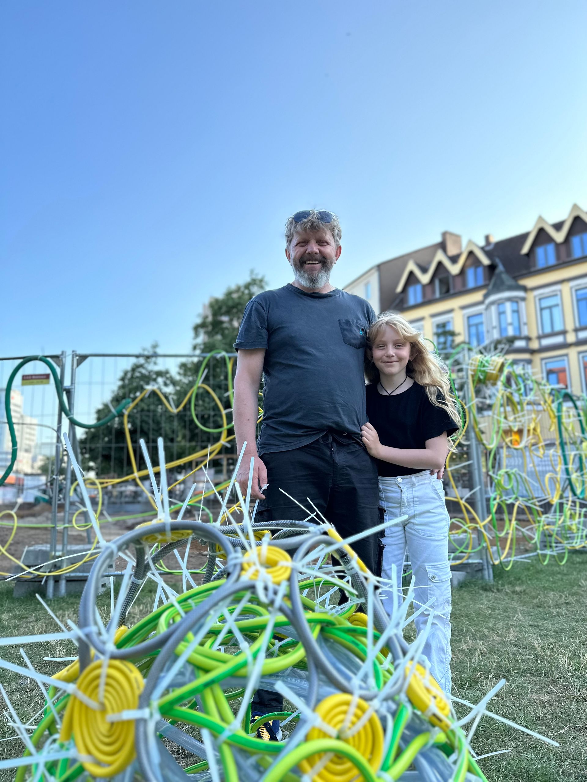 Einen „Unort“ möchte Familie Reinhardt bei „Lerbach leuchtet“ bespielen, einen Ort, der meist unbeachtet ist, der aber einlädt zum Innehalten und zum Hinhören, um die Geräusche des Wassers wahrzunehmen. In Gestalt von Mutter Angelika, Tochter Anna und Sohn Nick haben sie mit Begeisterung die Geräusche und Bewegungen des Wassers mit in Kreisen verschlungenen Wasserschläuchen eingefangen und in Linie transformiert. Wasserschläuche, die aus der Skulptur wieder ins Wasser hineinragen, als ob das Wasser aus ihnen wieder herausflösse. „Rausch“, so müsste die Installation heißen, meinte Nick. Und Angelika berichtet von den unterschiedlichen Geräuschen, die das Wasser macht, je nachdem, wo und wann man sich am Bach in Lerbach befindet. „Mal hört man ihn gar nicht, weil er unterirdisch verläuft, mal gluckst, sprudelt oder plätschert er, mal strömt er, mal rauscht er gar“, berichtet die Kunstlehrerin. Mit diesen Geräuschen sei sie aufgewachsen und darauf habe sie auch ihre Kinder immer wieder aufmerksam gemacht. Die Kindheit sei kein Zeitraum, bemerkte Jacques Brel einmal, sondern ein Ort. Mitunter auch ein Ort, der gluckst und sprudelt und rauscht. Man muss nur hinhören.