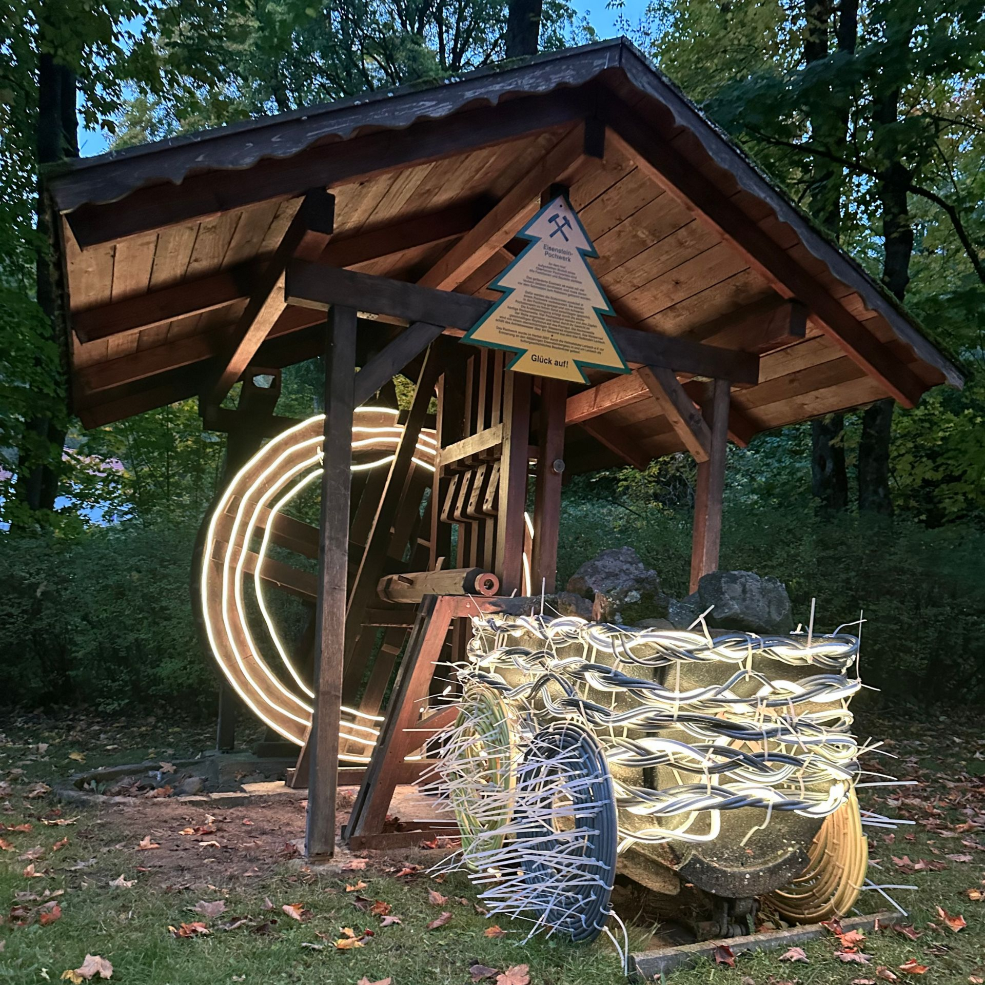 Der Harzclub packt an. Auch im Dauerregen. „Das ist bei uns kein Thema“, sagt Vorsitzender Frank Koch, „da ist jeder bei der Sache“. Und so rückten sie dann an, zu fünft am Pochwerk in Lerbach, dieser originalgetreuen Nachbildung, die auf die Geschichte des Bergbaus in Lerbach und überhaupt im Harz verweist. Auf solche Sehenswürdigkeiten aufmerksam zu machen, gehört ja inzwischen zu den vornehmsten Aufgabe der Harzclubs, wie Koch erzählt. Diesmal jedoch waren sie nicht im Dienste des Tourismus, sondern der Kunst unterwegs und haben das Freiluftmuseum mit Wasser- und Lichtschläuchen markant akzentuiert. Ganz schön nass seien sie dabei schon geworden, berichtet Koch, aber anschließend habe man noch zusammen gegessen und getrunken. Und das sei doch das wichtigste.