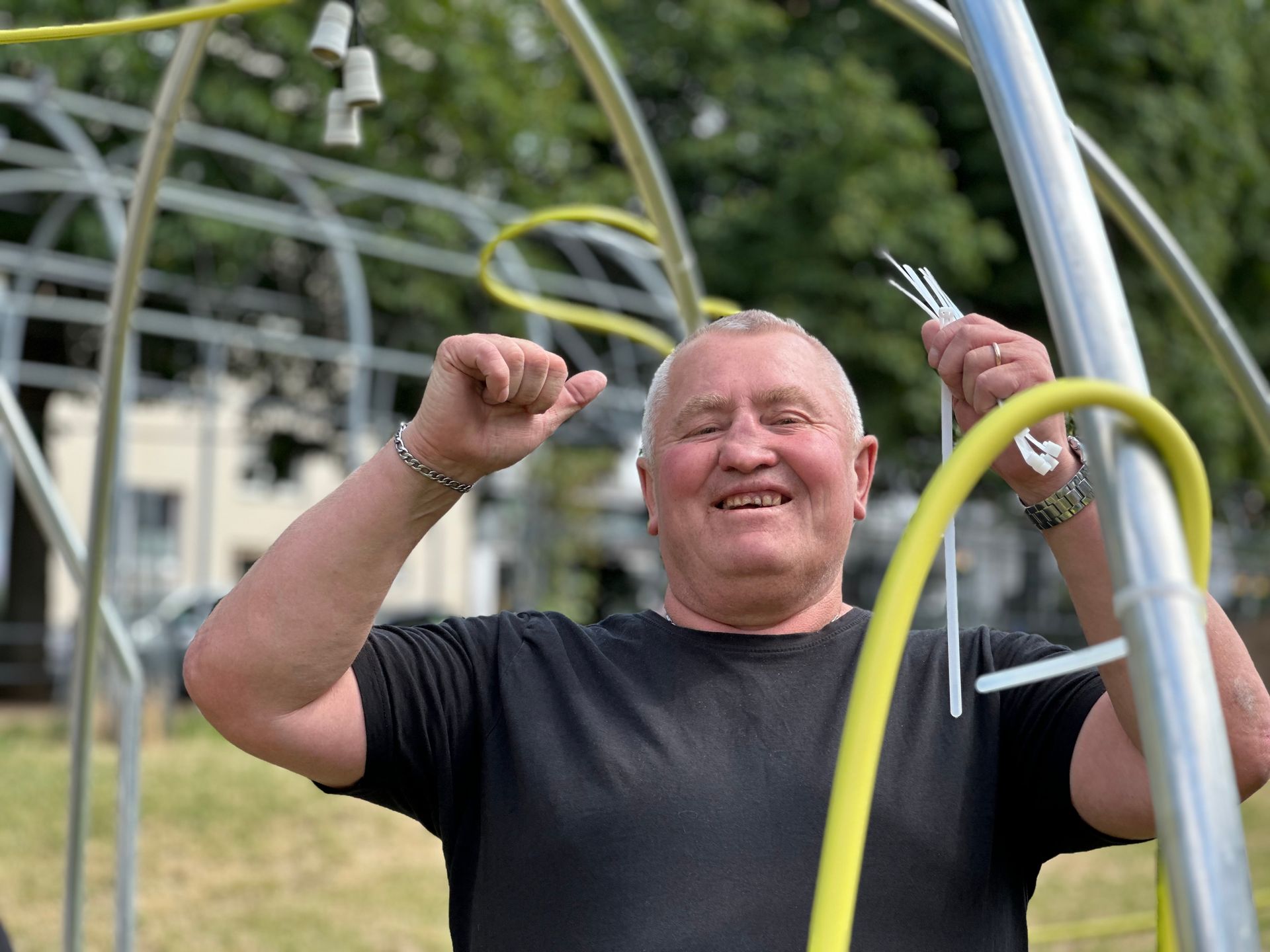 Schwarmkunst ist überhaupt ein inklusives Projekt. Das zeigt sich auch bei der Gruppe von Hörgeschädigten, die schon seit Jahren immer wieder an Schwarmkunstprojekten von Kerstin Schulz teilnimmt. So auch diesmal wieder, bei panta rhei. Hier werden eben nicht nur Schläuche geknüpft, sondern auch soziale Verbindungen. Zwischenmenschliches.