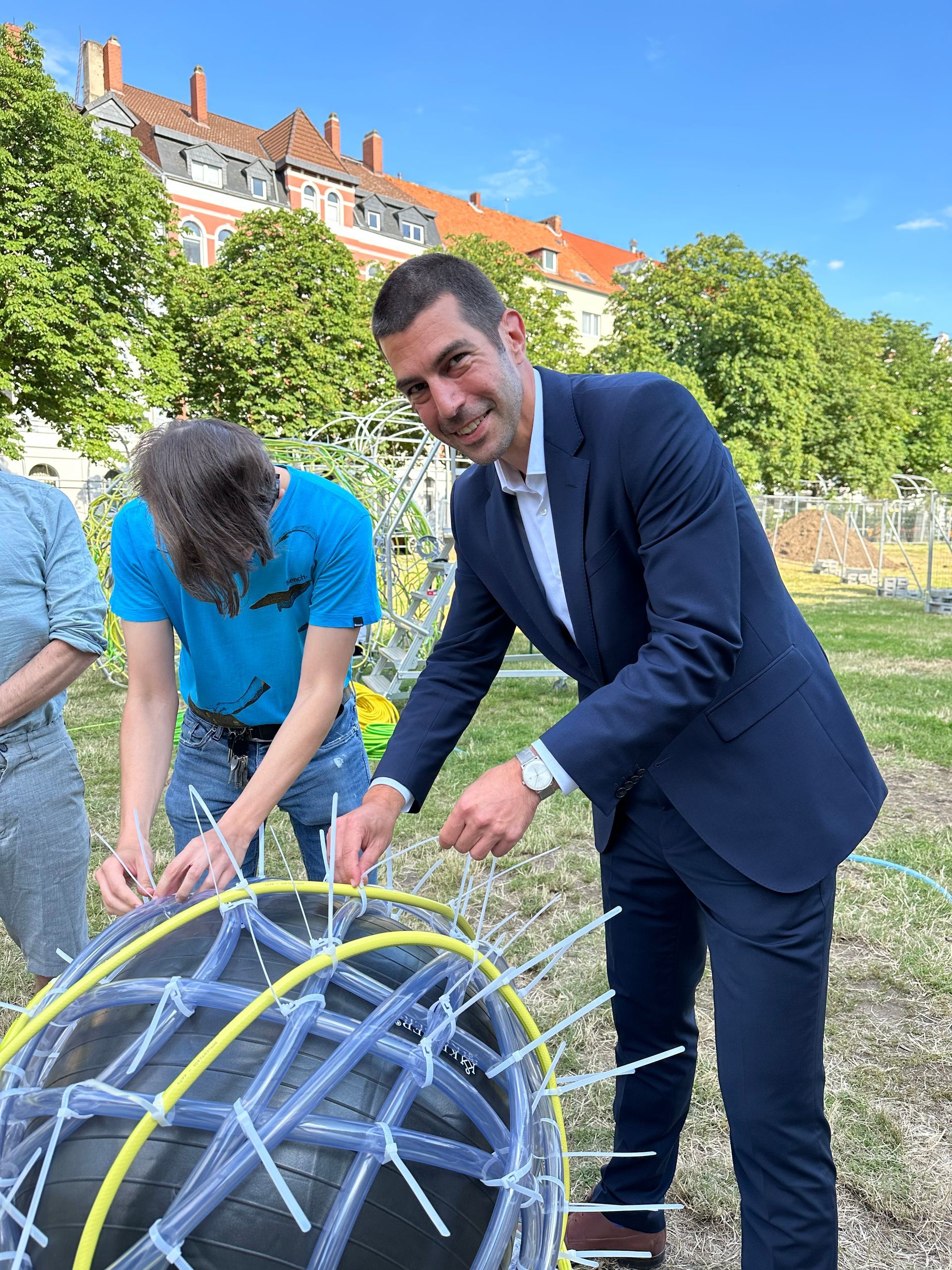 Das zeigte sich gestern, als Vertreter von Politik und Verwaltung im Anschluss an eine Veranstaltung im Pavillon zum Fototermin auf dem Platz einfielen. Mit dabei der oberste Sachwalter für Sicherheit und Ordnung in der Stadt, Axel von der Ohe, der sich kurz auch als Schlauchknüpfer übte. Sein Erscheinen löste auch Protest aus, von einem wütenden Menschen am Rande des Platzes, der einen Verlust beklagte. Einen Verlust, der in den ganzen Diskussionen zur Innenstadtentwicklung und zur Neugestaltung der bahnhofsnahen Plätze bisher kaum vorkommt.