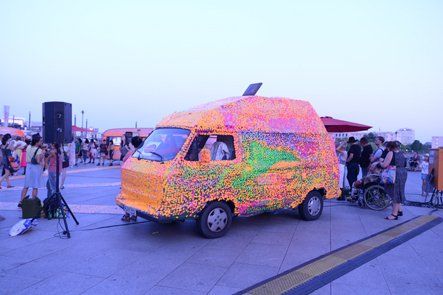 Five Lovemobiles drive in a parade from city to city (requested for Berlin, Hanover, Bochum, Leibzig) and are placed in a central location as a museum wagon cluster.