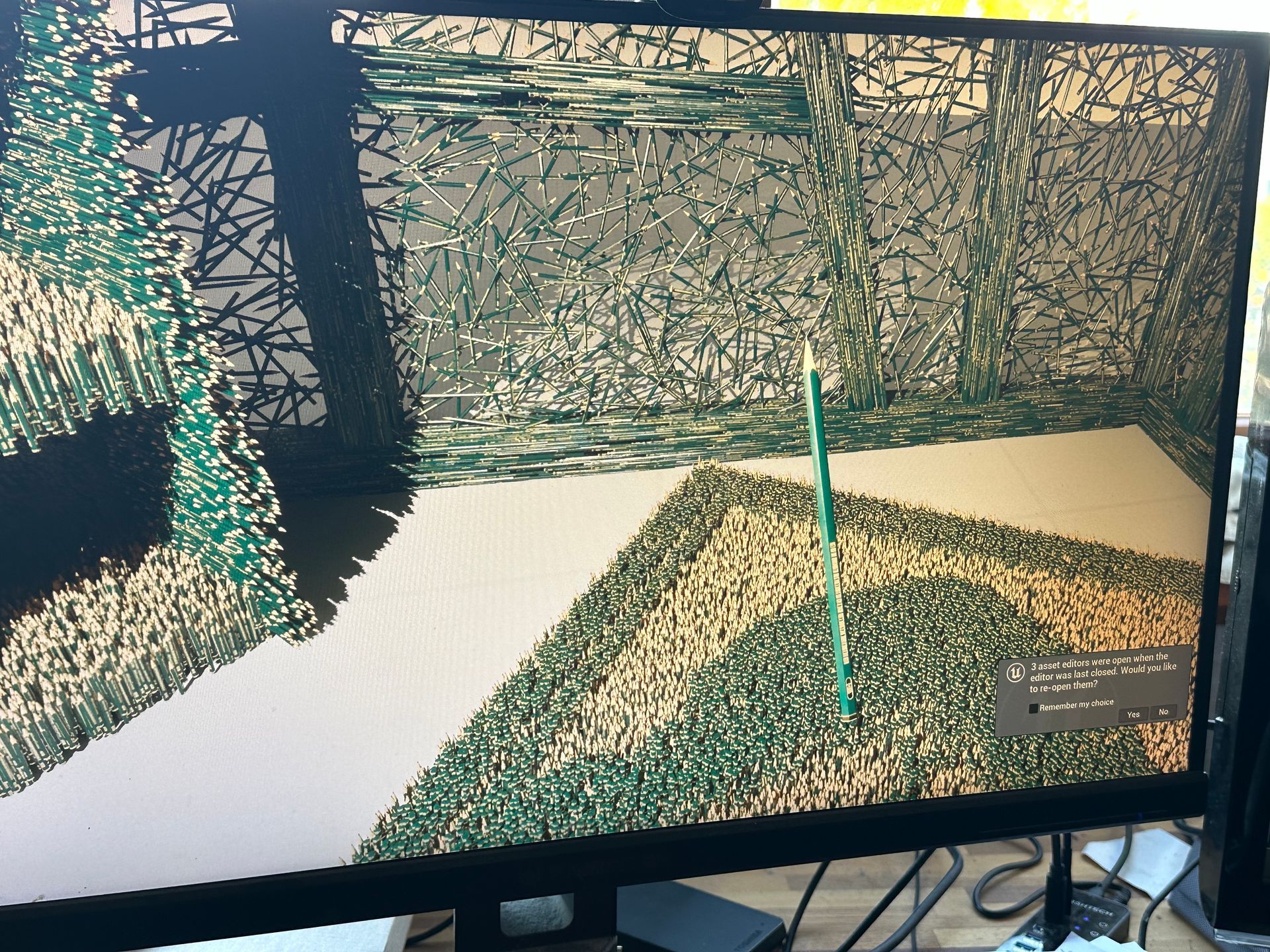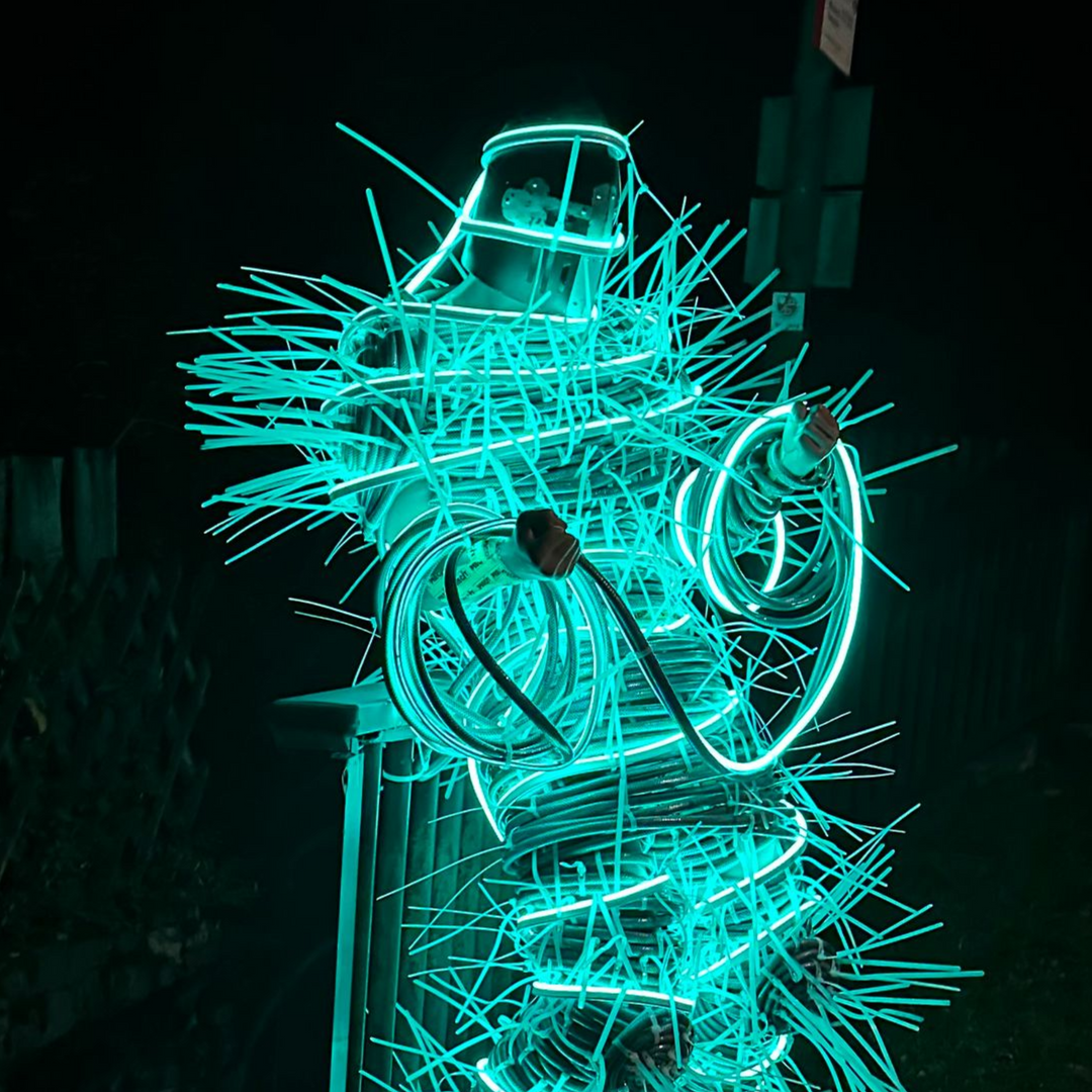 Eine Hommage an das Schwarmkunstereignis 2023 auf dem Weißekreuzplatz in Hannover und zugleich eine Ode an das vergangene Werk, an das menschliche Miteinander und das Miteinander von ungleichen Materialien und Formen. Entstanden durch die Hände vieler, und doch durch den kreativen Akt eines Einzelnen geprägt. Bei Nacht verwandelt sich das Zelt, wenn die Umgebung in die Dunkelheit zurückgetreten ist. Es wird zum Leuchtturm der Farben, ein pulsierendes Spiel aus Licht und Bewegung. Lange, geschwungene Linien, wie der Lerbach selbst, tanzen von der Kuppel zum Boden und ergießen sich über die Wiese. Das Licht im Dunkeln wird zum kreativen Impuls, zum Anstoß, die eigene Vorstellungskraft zu beflügeln. Hier trifft man nicht nur auf Freunde, sondern vielleicht auch auf Fremde, die sich im Rahmen einer Schwarmkunstaktion miteinander verbinden und so zu neuen Verbindungen und gemeinsamer Kreativität finden. Dieses Werk ist ein lebendiges, sich ständig veränderndes Experiment, das den Dialog mit dem Publikum sucht und Platz für neue Ideen und Interpretationen lässt. Es lädt ein, Normen zu hinterfragen, umzudenken und das Unbekannte zu umarmen. Ein Ort der Begegnung – sowohl mit anderen als auch mit der eigenen Fantasie.