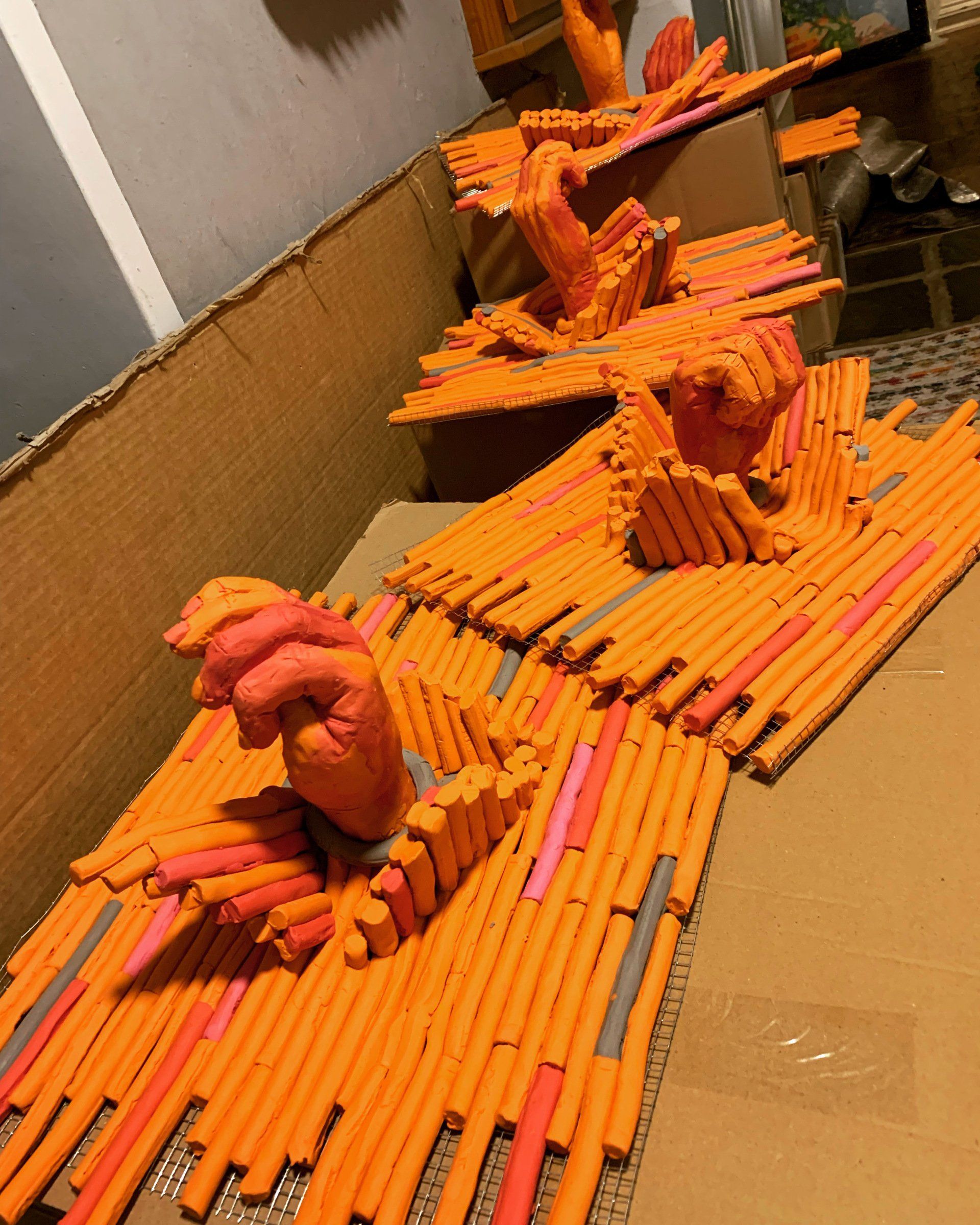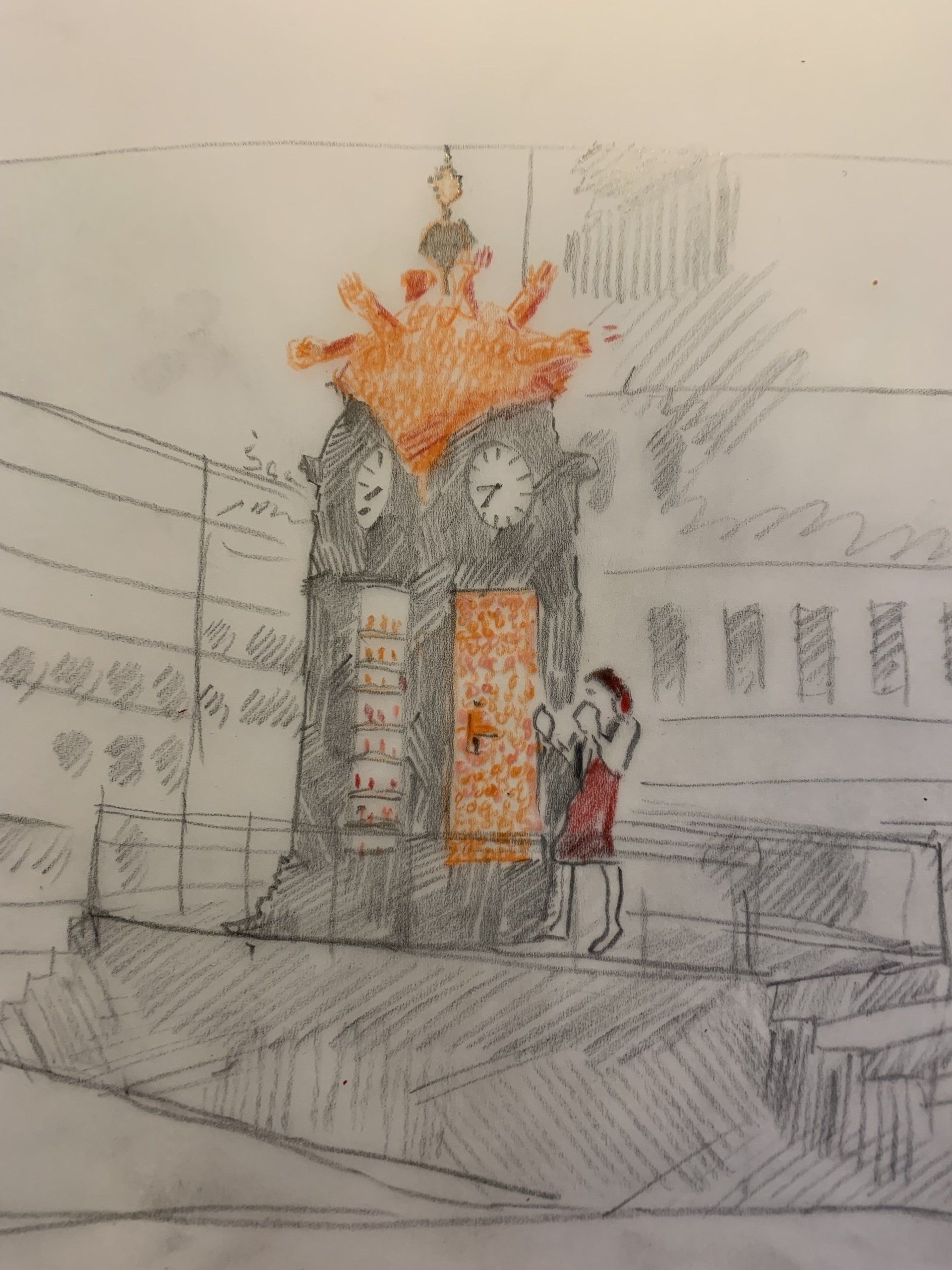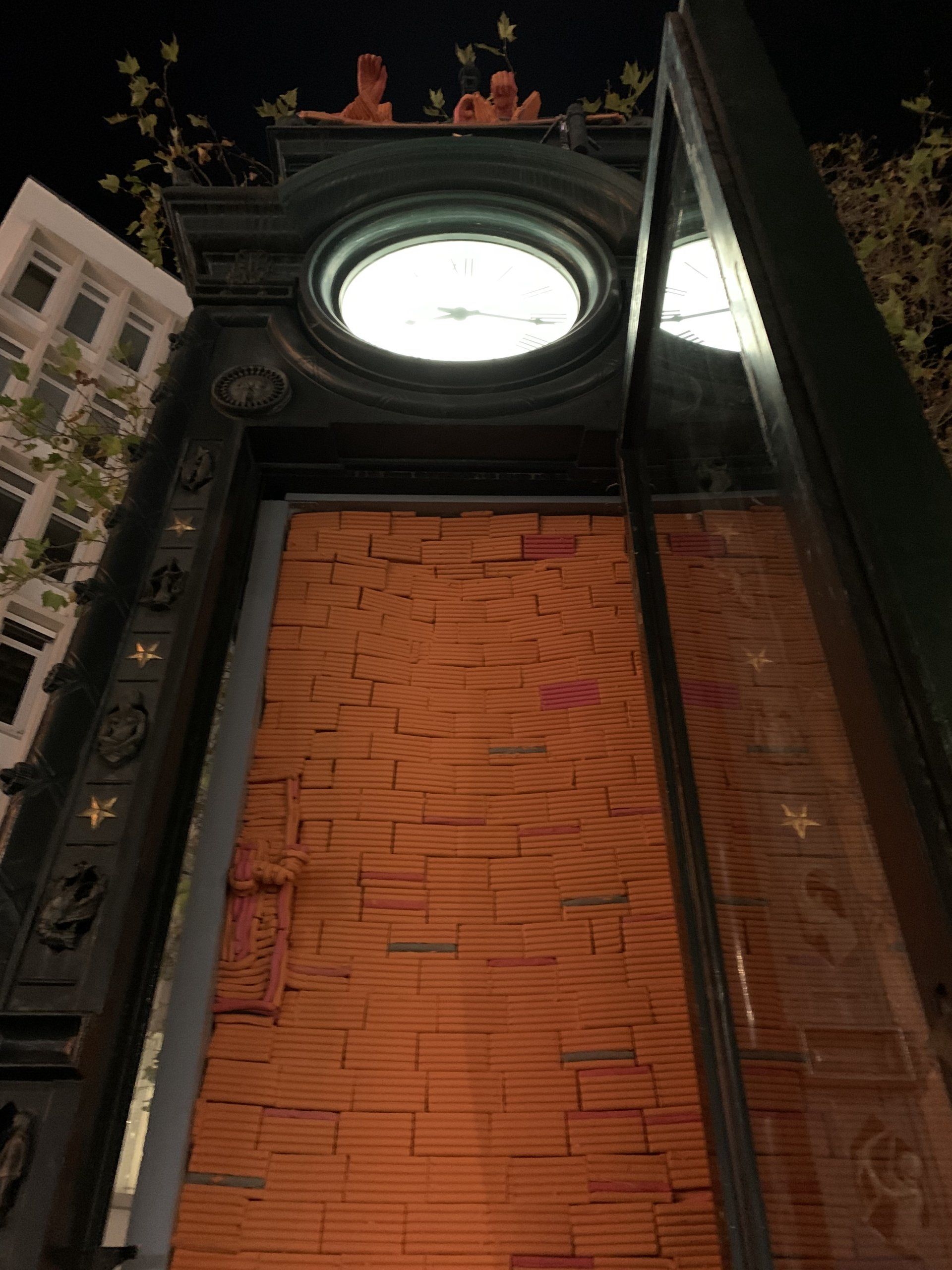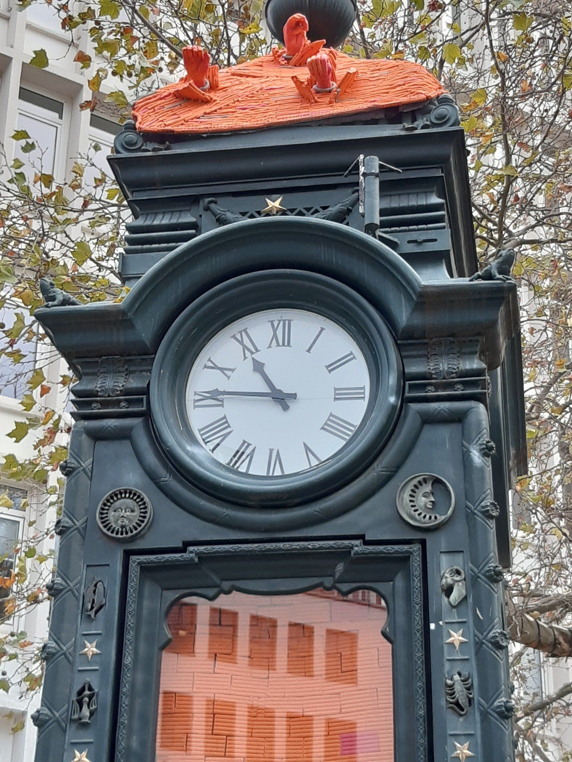 Dafür wird Schulz die gläserne Tür der historischen Uhr durch eine geschlossene Front ersetzen, die den Blick ins Innere zunächst verhindert. Diese Tür ist ebenso wie die Handzeichen auf dem Dach aus orangefarbener Knetmasse gestaltet, die auch bei der Fertigung von Crashtest-Dummys Verwendung findet.