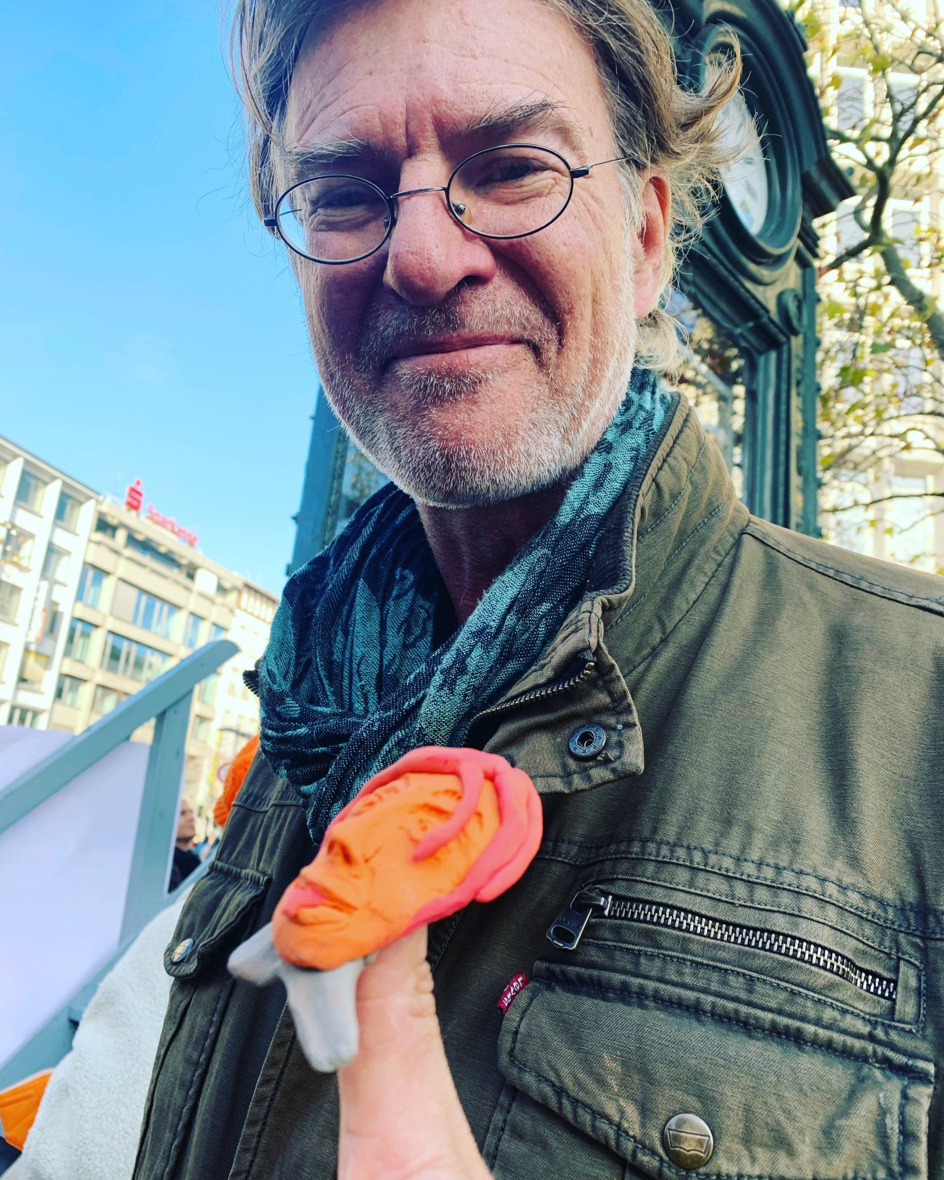 Ein sonniger Herbstsamstag in Hannovers Innenstadt. Die Glasfront der Kröpcke-Uhr ist geöffnet, die verschlossene Tür aus orangefarbener Knetmasse den Blicken und dem Zugriff der Passanten und Passantinnen preisgegeben. Und viele bleiben neugierig stehen, erkundigen sich und machen schließlich mit, indem sie das Tabu symbolisch aufbrechen und kleine Skulpturen gegen häusliche Gewalt formen, Gedanken, Gehörtes und mitunter auch Erlebtes.
