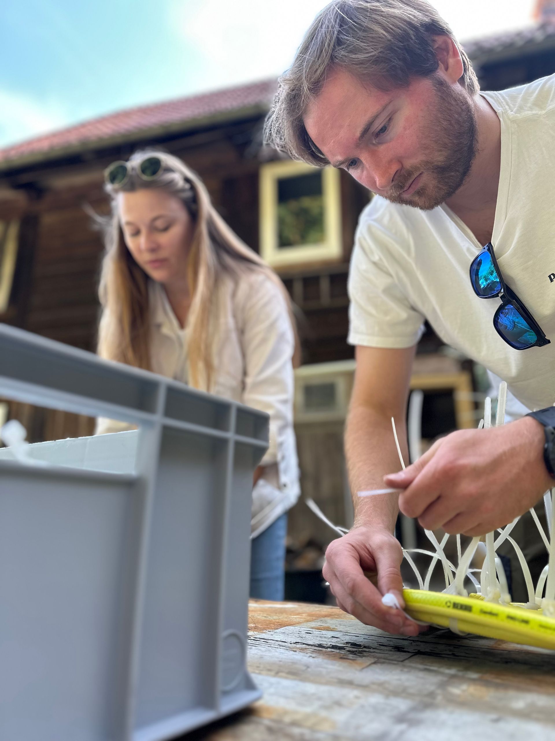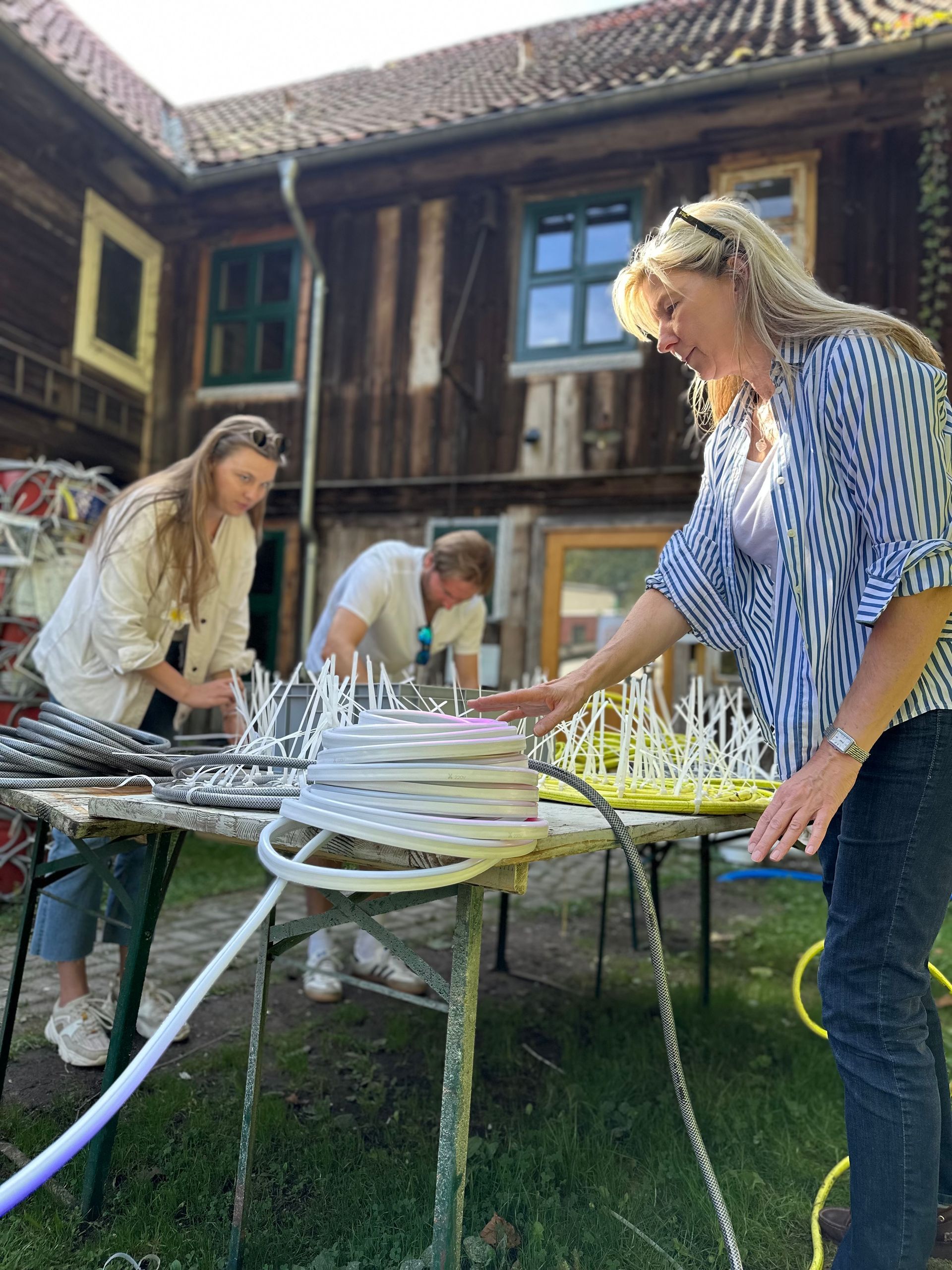 Schnell wie die Feuerwehr! Diesen Workshop-Teilnehmern war das Arbeitsmaterial Schlauch keineswegs fremd. Mit Feuereifer hat die Jugendfeuerwehr Lerbach eine Skulptur erstellt, die sich passenderweise aus Rettungsringen zusammensetzt. Fünf große, schwarze Schläuche, umwickelt von bunten Schläuchen und durchzogen von transparenten Leuchtschläuchen bilden das Werk, zusammengehalten von Original Feuerwehrschläuchen. Ein eingespieltes Team war da zugange. „Einige erwachsene Aktive haben die Kinder und Jugendlichen unterstützt, aber die waren auch so engagiert dabei“, erzählt Ilka Grobecker, seit 17 Jahren Jugendwartin der Feuerwehr, der sie selbst seit 40 Jahren angehört. Man merkt gleich, die Feuerwehr Lerbach feiert nicht umsonst gerade ihr 150-jähriges Jubiläum, hier ist Beständigkeit Trumpf. Das gleiche Entstehungsjahr, also 1875, weist auch das Feuerwehrhaus auf, hinter dem die Skulptur im Schatten der Kaisereiche platziert wird. „Die Jugendlichen sind schon ganz gespannt auf den Start der Aktion ‚Lerbach leuchtet‘ und auf die anderen Beiträge“, sagt Grobecker. Der Blogger schließt sich da gern an.
