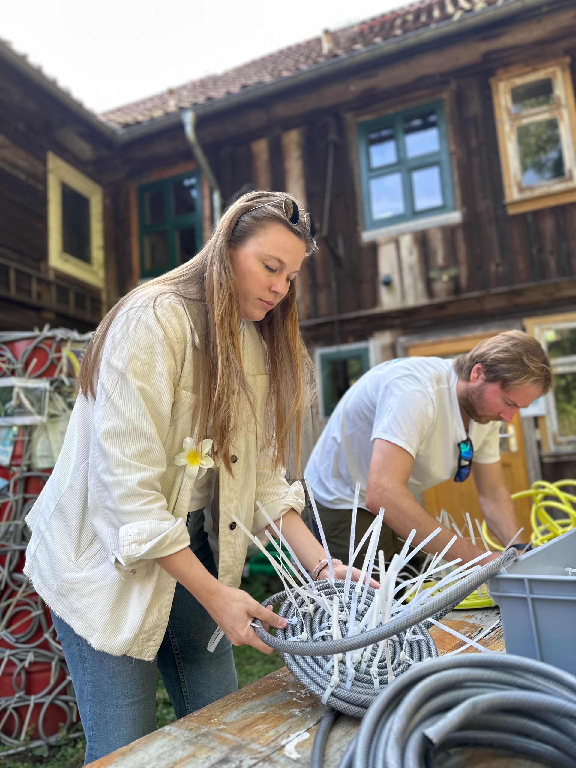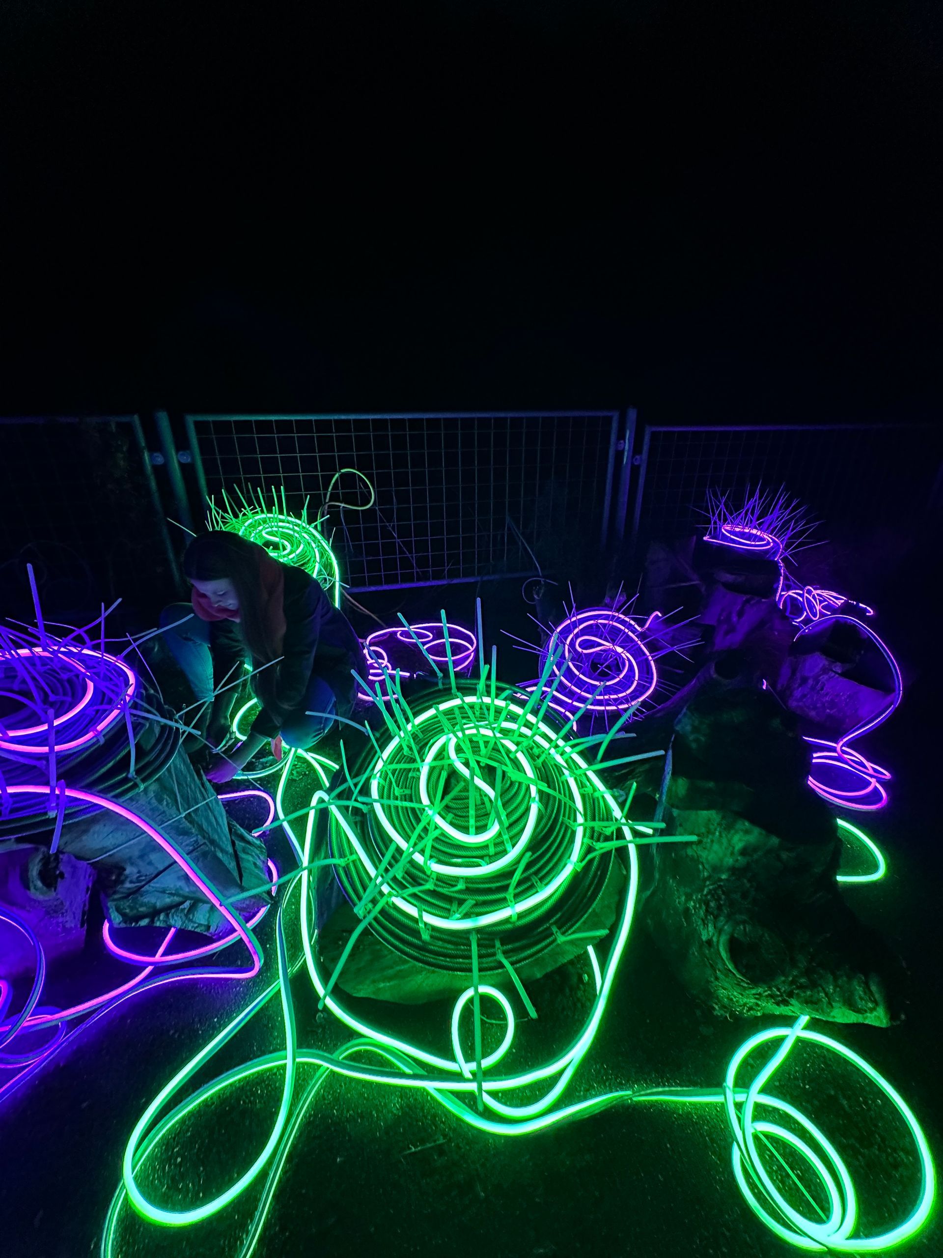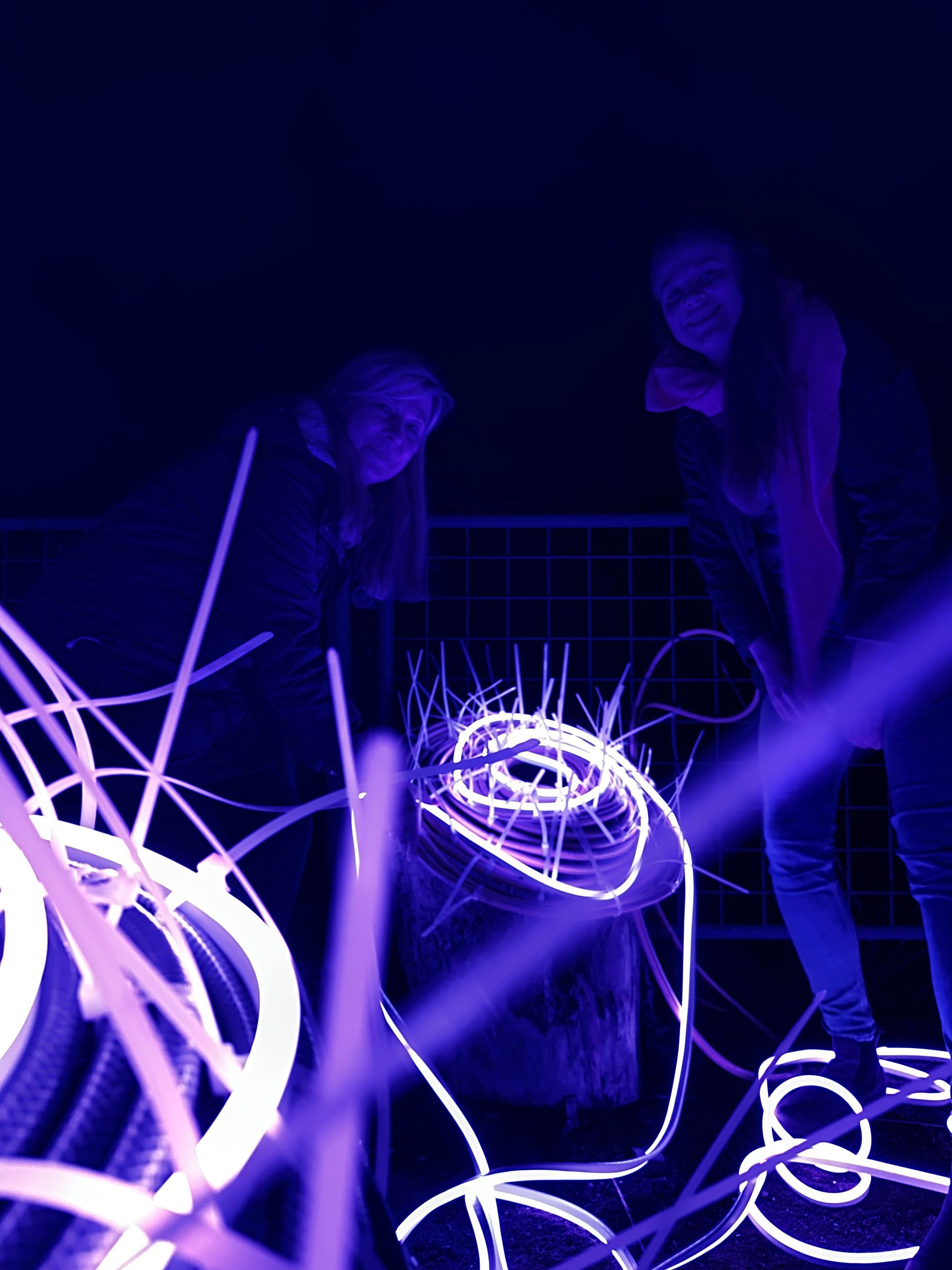 Einen „Unort“ möchte Familie Reinhardt bei „Lerbach leuchtet“ bespielen, einen Ort, der meist unbeachtet ist, der aber einlädt zum Innehalten und zum Hinhören, um die Geräusche des Wassers wahrzunehmen. In Gestalt von Mutter Angelika, Tochter Anna und Sohn Nick haben sie mit Begeisterung die Geräusche und Bewegungen des Wassers mit in Kreisen verschlungenen Wasserschläuchen eingefangen und in Linie transformiert. Wasserschläuche, die aus der Skulptur wieder ins Wasser hineinragen, als ob das Wasser aus ihnen wieder herausflösse.
