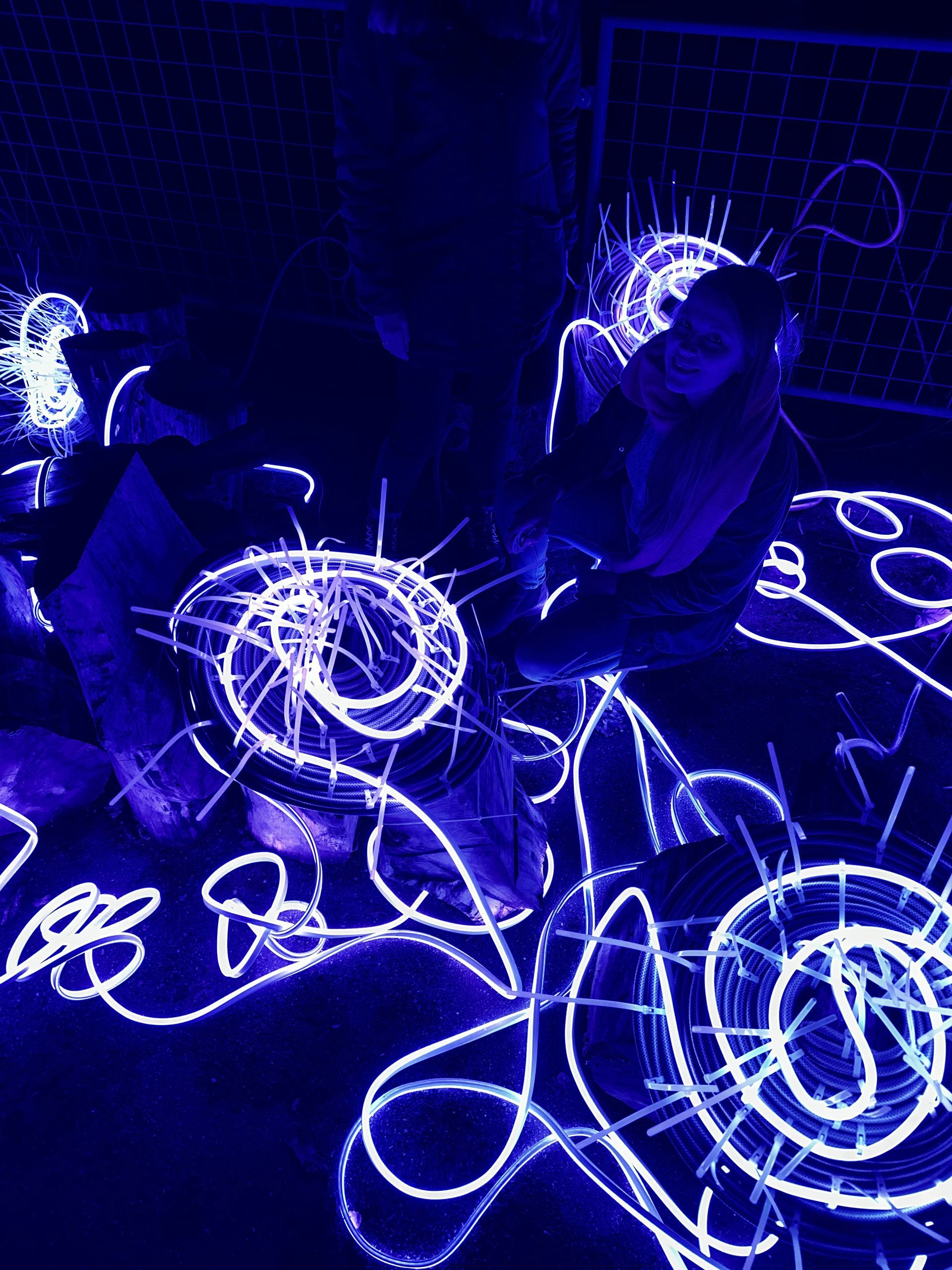 Eine Hommage an das Schwarmkunstereignis 2023 auf dem Weißekreuzplatz in Hannover und zugleich eine Ode an das vergangene Werk, an das menschliche Miteinander und das Miteinander von ungleichen Materialien und Formen. Entstanden durch die Hände vieler, und doch durch den kreativen Akt eines Einzelnen geprägt. Bei Nacht verwandelt sich das Zelt, wenn die Umgebung in die Dunkelheit zurückgetreten ist. Es wird zum Leuchtturm der Farben, ein pulsierendes Spiel aus Licht und Bewegung. Lange, geschwungene Linien, wie der Lerbach selbst, tanzen von der Kuppel zum Boden und ergießen sich über die Wiese. Das Licht im Dunkeln wird zum kreativen Impuls, zum Anstoß, die eigene Vorstellungskraft zu beflügeln. Hier trifft man nicht nur auf Freunde, sondern vielleicht auch auf Fremde, die sich im Rahmen einer Schwarmkunstaktion miteinander verbinden und so zu neuen Verbindungen und gemeinsamer Kreativität finden. Dieses Werk ist ein lebendiges, sich ständig veränderndes Experiment, das den Dialog mit dem Publikum sucht und Platz für neue Ideen und Interpretationen lässt. Es lädt ein, Normen zu hinterfragen, umzudenken und das Unbekannte zu umarmen. Ein Ort der Begegnung – sowohl mit anderen als auch mit der eigenen Fantasie.