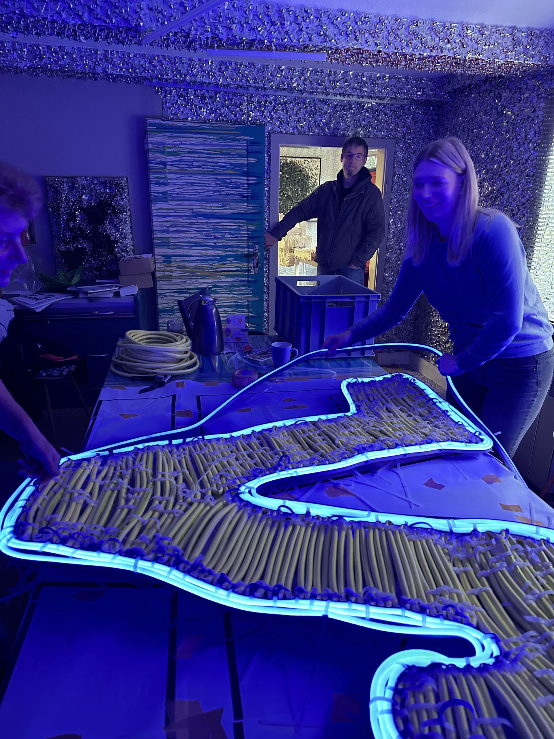 Einen „Unort“ möchte Familie Reinhardt bei „Lerbach leuchtet“ bespielen, einen Ort, der meist unbeachtet ist, der aber einlädt zum Innehalten und zum Hinhören, um die Geräusche des Wassers wahrzunehmen. In Gestalt von Mutter Angelika, Tochter Anna und Sohn Nick haben sie mit Begeisterung die Geräusche und Bewegungen des Wassers mit in Kreisen verschlungenen Wasserschläuchen eingefangen und in Linie transformiert. Wasserschläuche, die aus der Skulptur wieder ins Wasser hineinragen, als ob das Wasser aus ihnen wieder herausflösse. „Rausch“, so müsste die Installation heißen, meinte Nick. Und Angelika berichtet von den unterschiedlichen Geräuschen, die das Wasser macht, je nachdem, wo und wann man sich am Bach in Lerbach befindet. „Mal hört man ihn gar nicht, weil er unterirdisch verläuft, mal gluckst, sprudelt oder plätschert er, mal strömt er, mal rauscht er gar“, berichtet die Kunstlehrerin. Mit diesen Geräuschen sei sie aufgewachsen und darauf habe sie auch ihre Kinder immer wieder aufmerksam gemacht. Die Kindheit sei kein Zeitraum, bemerkte Jacques Brel einmal, sondern ein Ort. Mitunter auch ein Ort, der gluckst und sprudelt und rauscht. Man muss nur hinhören.