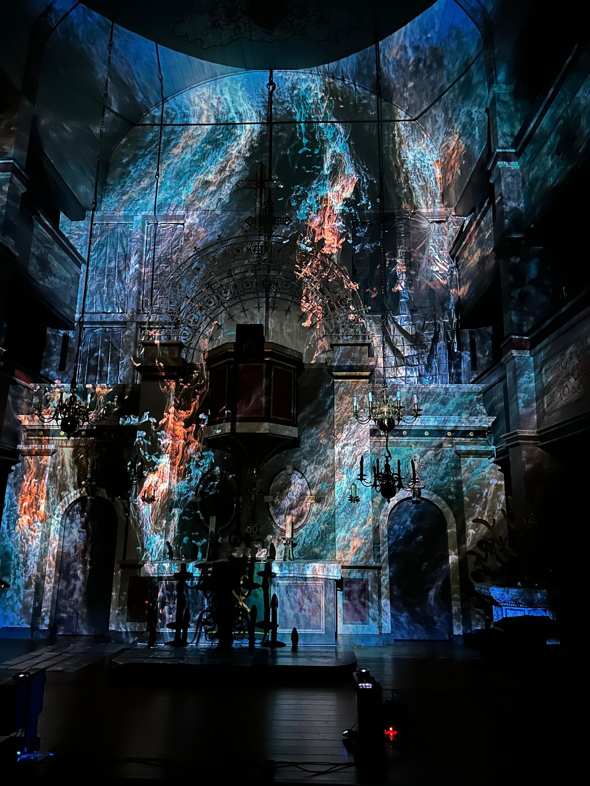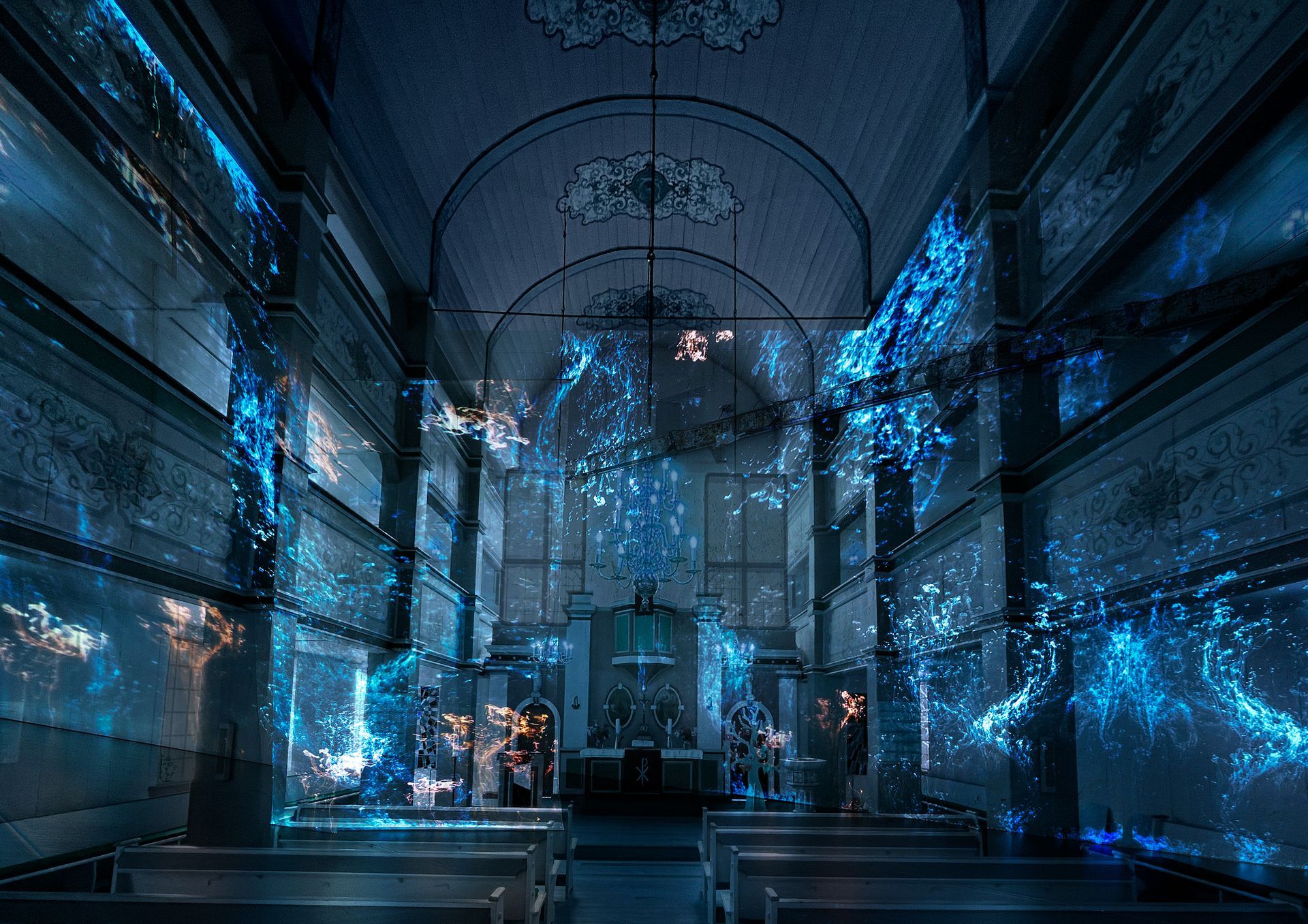 Licht und Wasser sind die Grundlage des Lebens. Die Eigenschaften von Wasser, das natürliche Fließverhalten von in Wasser gelöster Tusche und die damit verbundenen Spuren und Formen, bilden die Grundlage der Videoinstallation. Zeichentusche, im Wasser der Schwerkraft folgend, breitet sich aus, Bewegungsspuren werden sichtbar als Videoprojektion auf den bespielten Flächen im Kirchenraum. Eine Dynamik entsprechend den Gesetzmäßigkeiten der Natur, sei es in Organismen, in der Pflanzenwelt, bei mikro- und makrokosmischen Prozessen oder in Lebenskreisläufen, bei denen Bewegung, Energie und Wachstum den Prozess der Formgebung bestimmen.