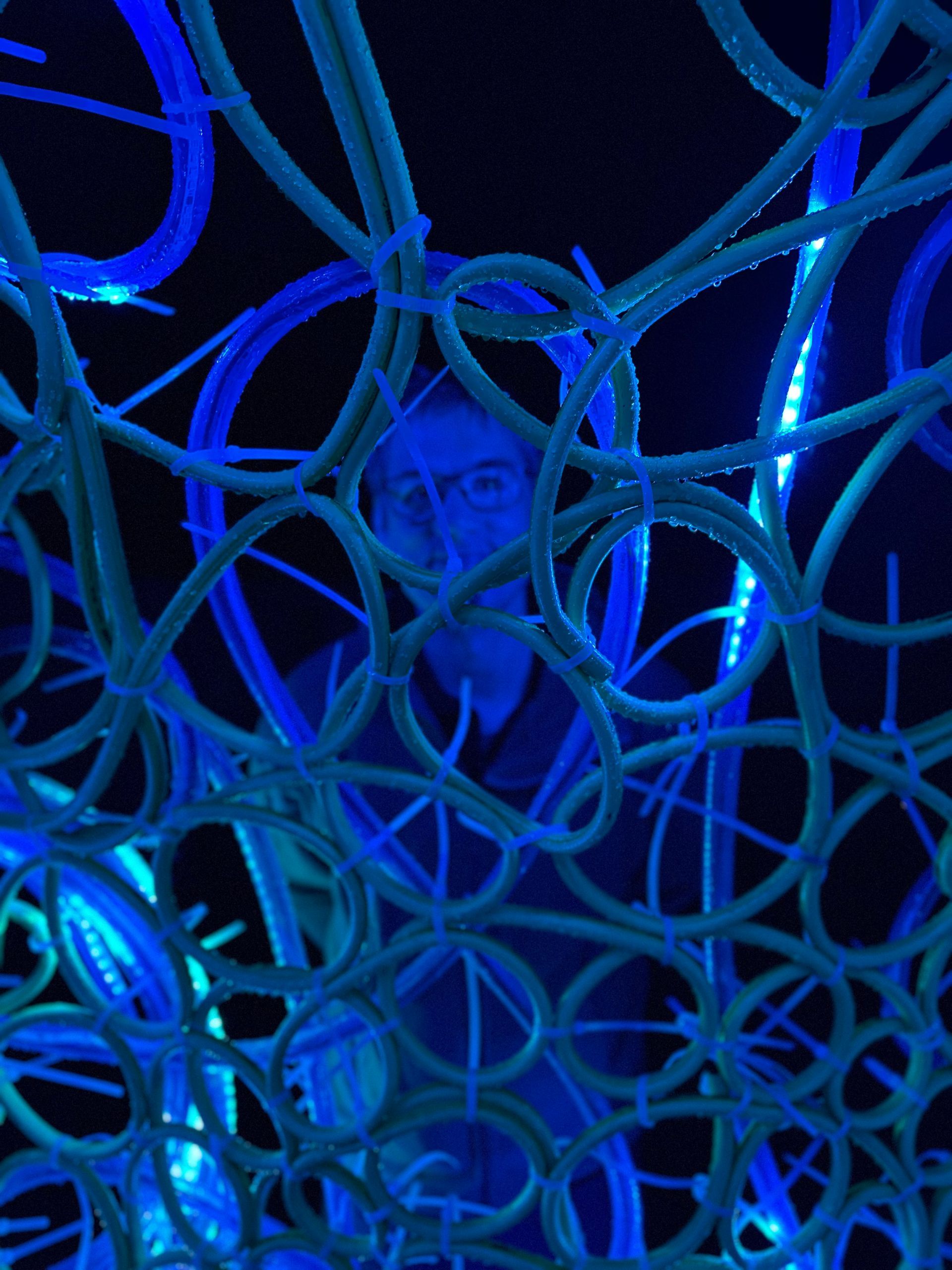 Einen „Unort“ möchte Familie Reinhardt bei „Lerbach leuchtet“ bespielen, einen Ort, der meist unbeachtet ist, der aber einlädt zum Innehalten und zum Hinhören, um die Geräusche des Wassers wahrzunehmen. In Gestalt von Mutter Angelika, Tochter Anna und Sohn Nick haben sie mit Begeisterung die Geräusche und Bewegungen des Wassers mit in Kreisen verschlungenen Wasserschläuchen eingefangen und in Linie transformiert. Wasserschläuche, die aus der Skulptur wieder ins Wasser hineinragen, als ob das Wasser aus ihnen wieder herausflösse. „Rausch“, so müsste die Installation heißen, meinte Nick. Und Angelika berichtet von den unterschiedlichen Geräuschen, die das Wasser macht, je nachdem, wo und wann man sich am Bach in Lerbach befindet. „Mal hört man ihn gar nicht, weil er unterirdisch verläuft, mal gluckst, sprudelt oder plätschert er, mal strömt er, mal rauscht er gar“, berichtet die Kunstlehrerin. Mit diesen Geräuschen sei sie aufgewachsen und darauf habe sie auch ihre Kinder immer wieder aufmerksam gemacht. Die Kindheit sei kein Zeitraum, bemerkte Jacques Brel einmal, sondern ein Ort. Mitunter auch ein Ort, der gluckst und sprudelt und rauscht. Man muss nur hinhören.