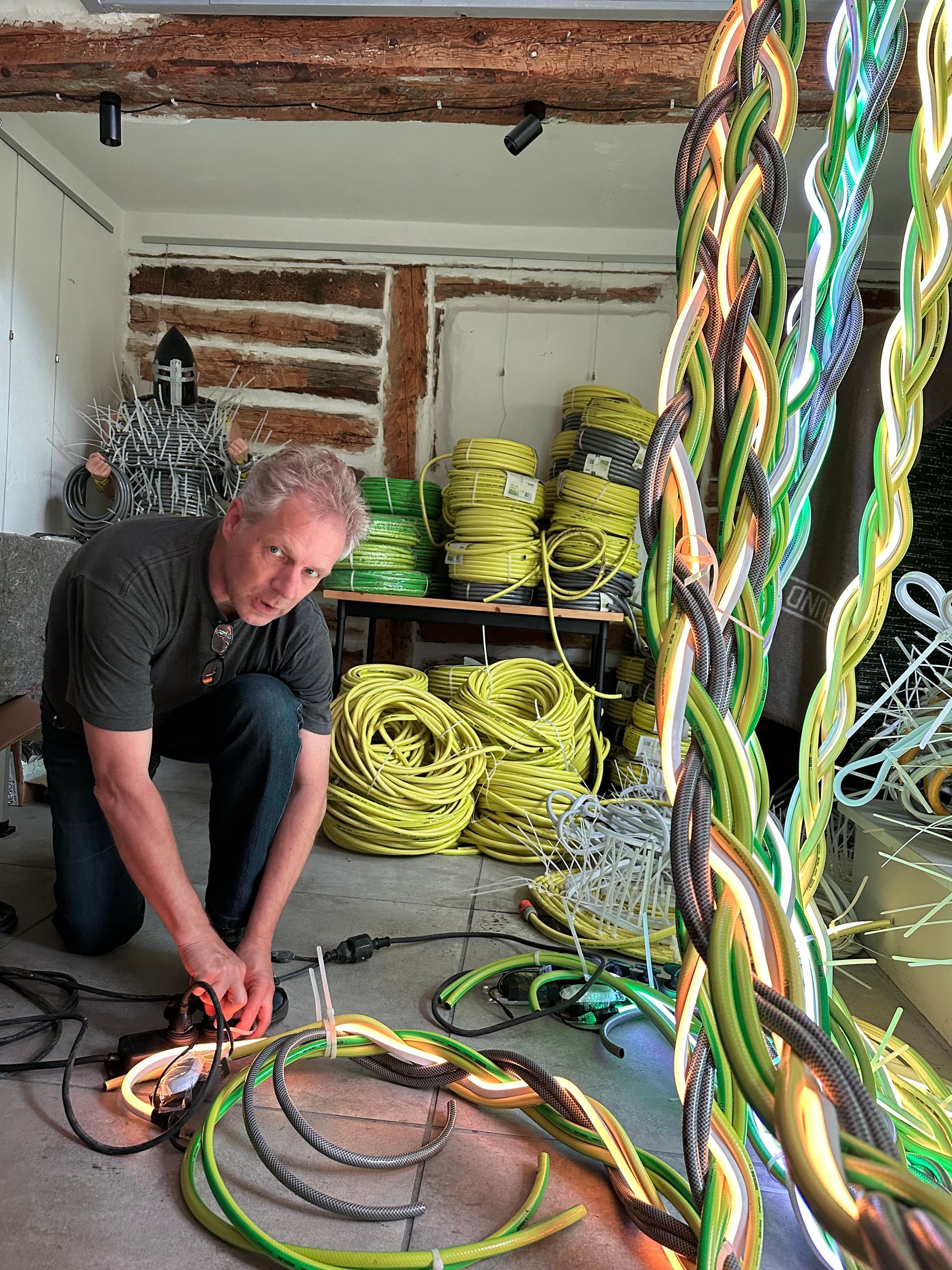 Wenn Lerbach leuchten soll, dann aber richtig – das dachte sich der Bürgerverein bei seinem Workshop und wollte sich gar nicht erst mit Kleinigkeiten aufhalten. 25 Meter Länge dürften die Schläuche schon haben, die dort mit vereinten Kräften zusammengeflochten wurden. Drei Schläuche in den Lerbacher Farben: schwarz, grün und gelb.