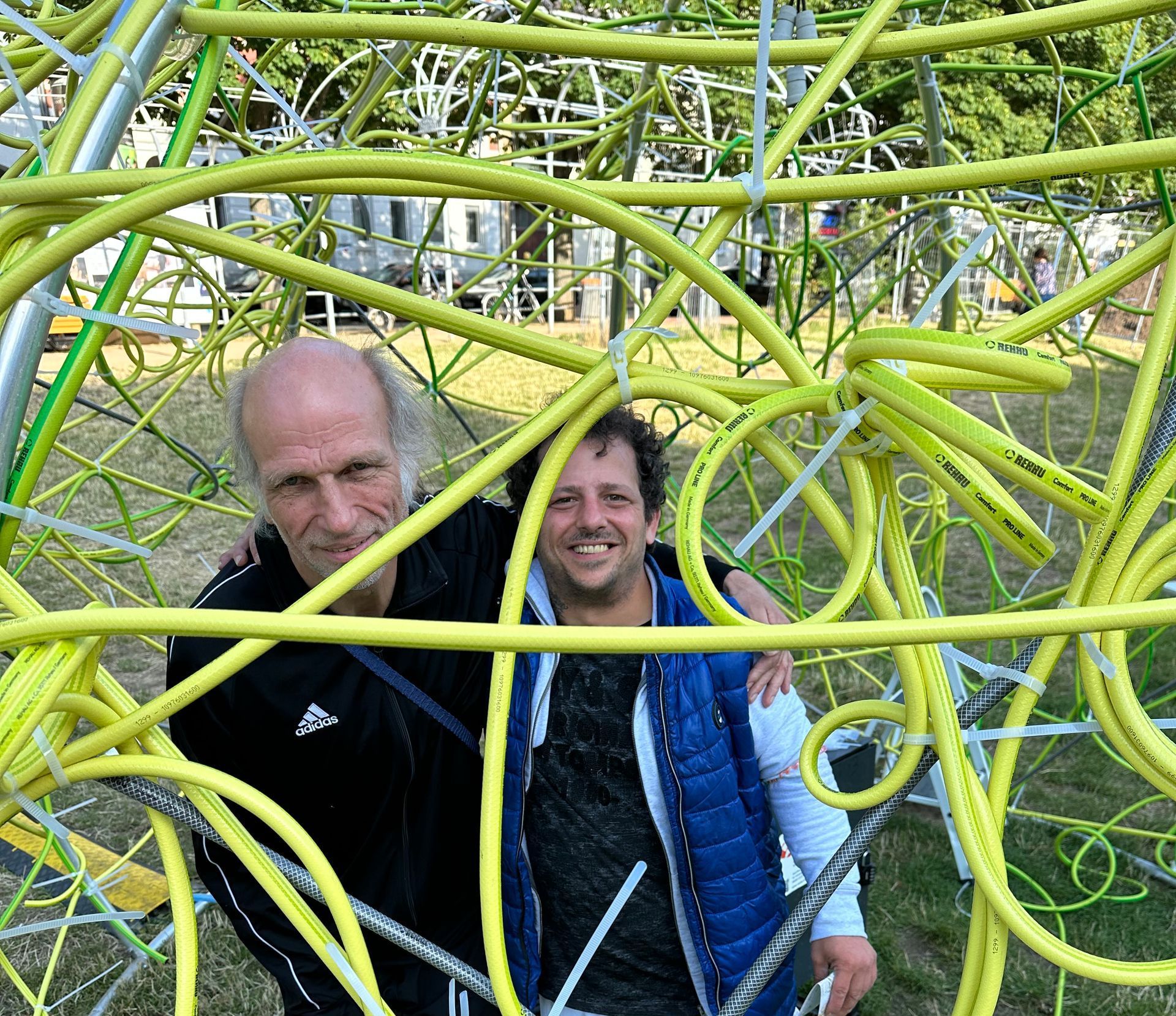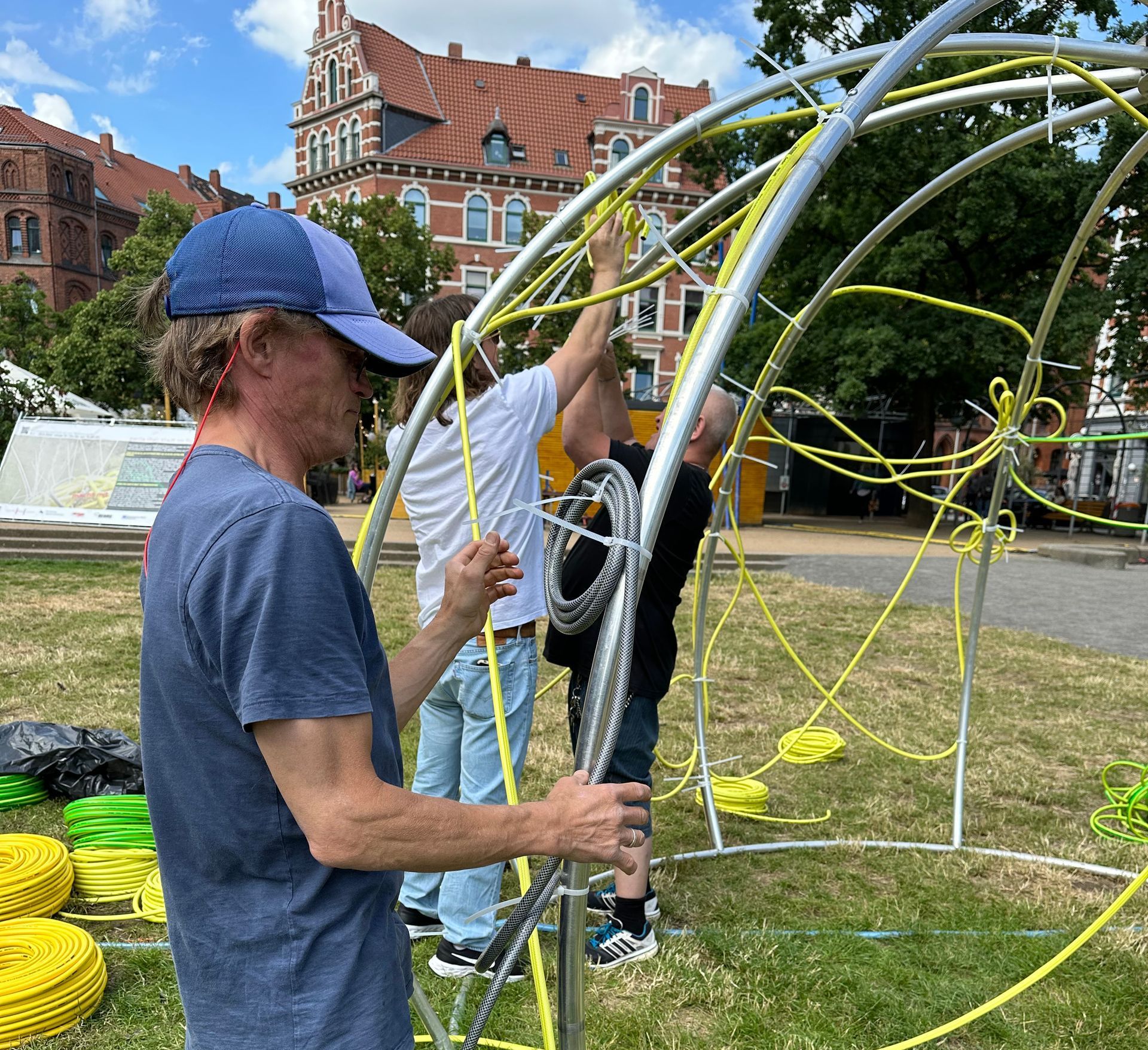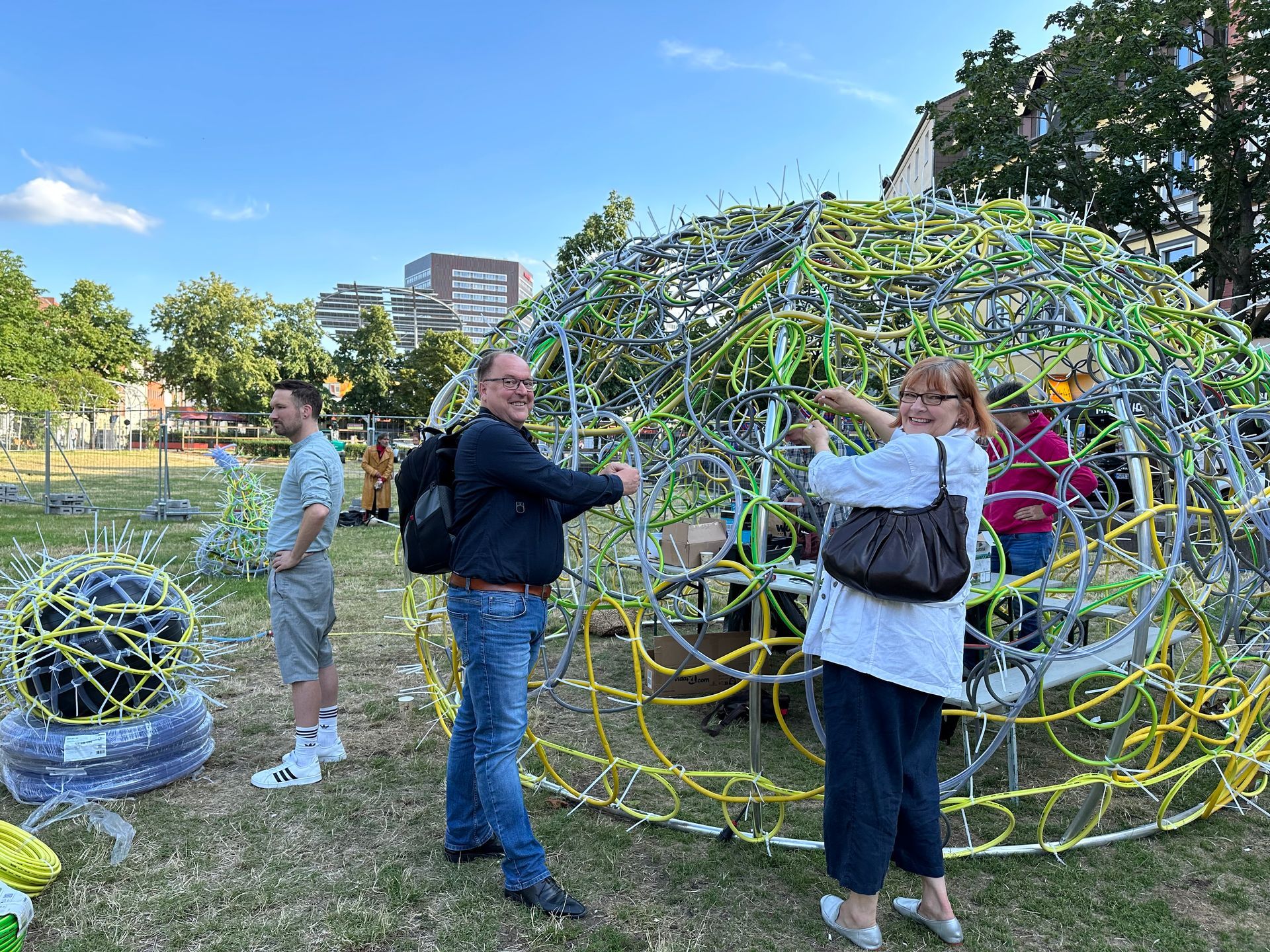 Schwarmkunst ist überhaupt ein inklusives Projekt. Das zeigt sich auch bei der Gruppe von Hörgeschädigten, die schon seit Jahren immer wieder an Schwarmkunstprojekten von Kerstin Schulz teilnimmt. So auch diesmal wieder, bei panta rhei. Hier werden eben nicht nur Schläuche geknüpft, sondern auch soziale Verbindungen. Zwischenmenschliches.
