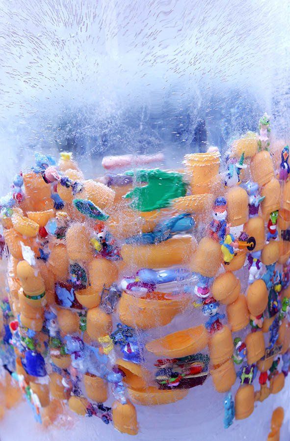 En el proceso de 10 talleres, se crearon 50 "cubos de basura de hielo" como esculturas de hielo. En las esculturas, la “basura” se congela con la ayuda de agua (ver imágenes, por ejemplo: bolígrafos, pelotas, vasos, plantas, camisetas...).