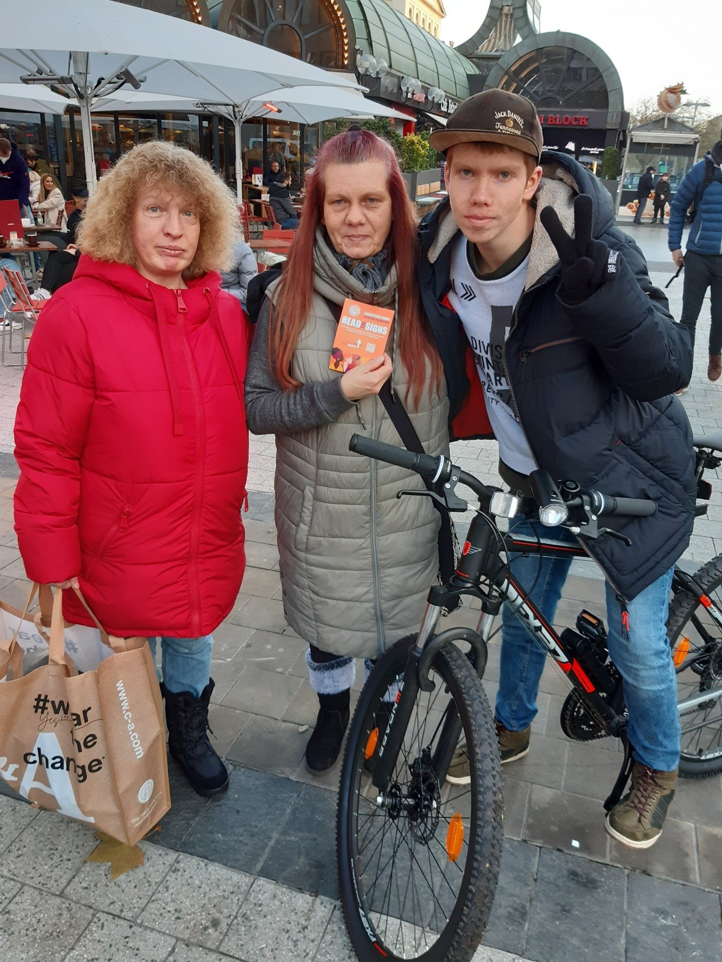 Elke, Monika und Leon hatten sich an der Kröpcke-Uhr verabredet und finden sich plötzlich in einem Kunstprojekt wieder. Sie halten die Aktion aber für eine gute Maßnahme, die unterstützt werden müsse. „Es ist so wichtig, nach draußen zu gehen und sich Hilfe zu holen“, sagt Monika, die häusliche Gewalt am eigenen Leibe erfahren hat. Acht Jahre habe sie das mitgemacht, bis sie sich einer Freundin anvertraut habe. Danach habe sie Unterstützung erhalten, sich eine Wohnung gesucht, Gesprächstherapien absolviert.