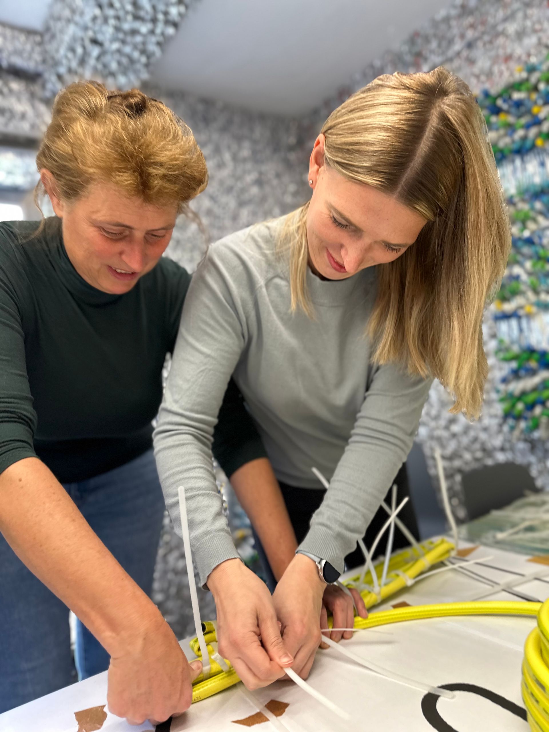 Schnell wie die Feuerwehr! Diesen Workshop-Teilnehmern war das Arbeitsmaterial Schlauch keineswegs fremd. Mit Feuereifer hat die Jugendfeuerwehr Lerbach eine Skulptur erstellt, die sich passenderweise aus Rettungsringen zusammensetzt. Fünf große, schwarze Schläuche, umwickelt von bunten Schläuchen und durchzogen von transparenten Leuchtschläuchen bilden das Werk, zusammengehalten von Original Feuerwehrschläuchen. Ein eingespieltes Team war da zugange. „Einige erwachsene Aktive haben die Kinder und Jugendlichen unterstützt, aber die waren auch so engagiert dabei“, erzählt Ilka Grobecker, seit 17 Jahren Jugendwartin der Feuerwehr, der sie selbst seit 40 Jahren angehört. Man merkt gleich, die Feuerwehr Lerbach feiert nicht umsonst gerade ihr 150-jähriges Jubiläum, hier ist Beständigkeit Trumpf. Das gleiche Entstehungsjahr, also 1875, weist auch das Feuerwehrhaus auf, hinter dem die Skulptur im Schatten der Kaisereiche platziert wird. „Die Jugendlichen sind schon ganz gespannt auf den Start der Aktion ‚Lerbach leuchtet‘ und auf die anderen Beiträge“, sagt Grobecker. Der Blogger schließt sich da gern an.