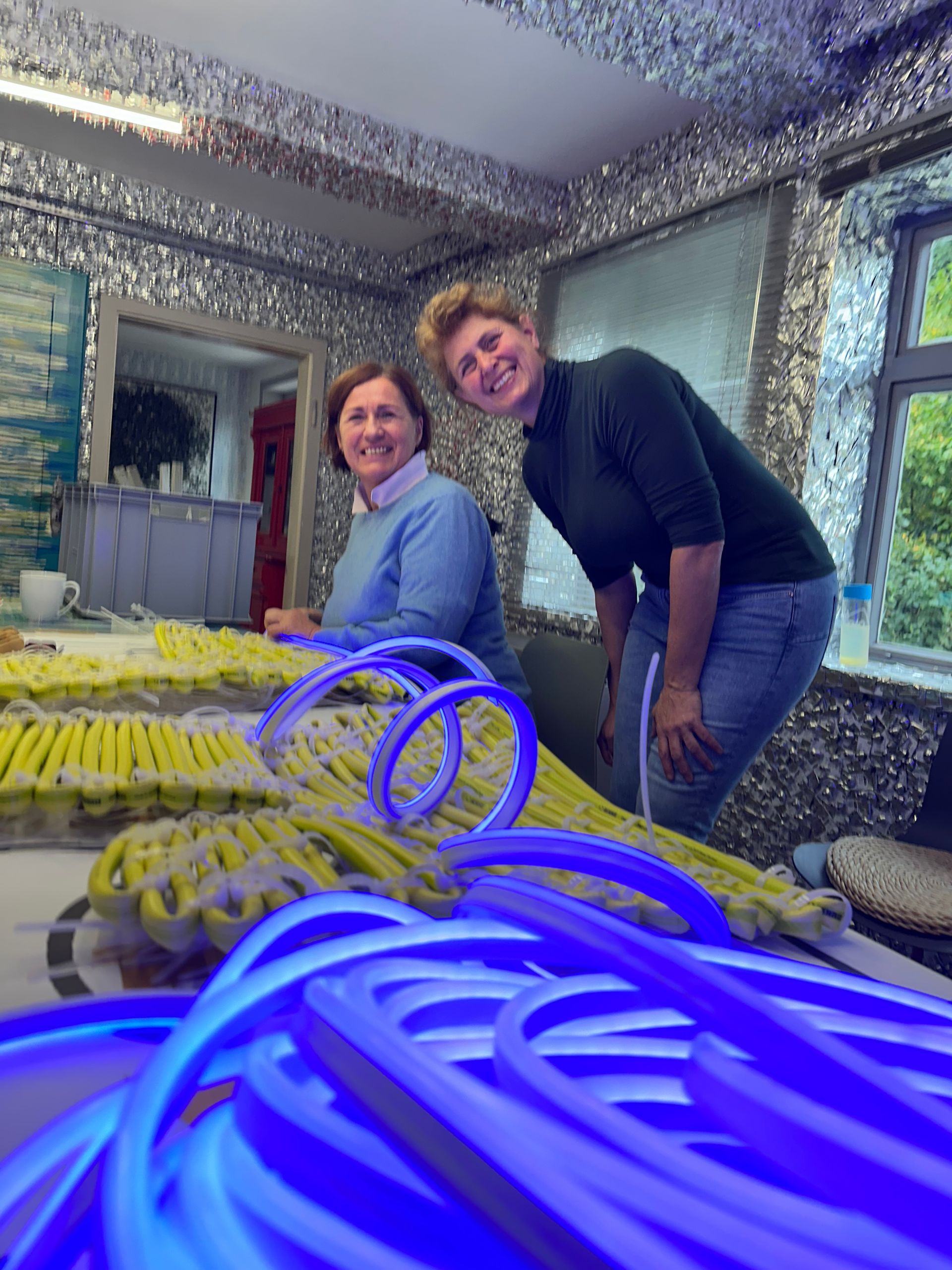 Eine Hommage an das Schwarmkunstereignis 2023 auf dem Weißekreuzplatz in Hannover und zugleich eine Ode an das vergangene Werk, an das menschliche Miteinander und das Miteinander von ungleichen Materialien und Formen. Entstanden durch die Hände vieler, und doch durch den kreativen Akt eines Einzelnen geprägt. Bei Nacht verwandelt sich das Zelt, wenn die Umgebung in die Dunkelheit zurückgetreten ist. Es wird zum Leuchtturm der Farben, ein pulsierendes Spiel aus Licht und Bewegung. Lange, geschwungene Linien, wie der Lerbach selbst, tanzen von der Kuppel zum Boden und ergießen sich über die Wiese. Das Licht im Dunkeln wird zum kreativen Impuls, zum Anstoß, die eigene Vorstellungskraft zu beflügeln. Hier trifft man nicht nur auf Freunde, sondern vielleicht auch auf Fremde, die sich im Rahmen einer Schwarmkunstaktion miteinander verbinden und so zu neuen Verbindungen und gemeinsamer Kreativität finden. Dieses Werk ist ein lebendiges, sich ständig veränderndes Experiment, das den Dialog mit dem Publikum sucht und Platz für neue Ideen und Interpretationen lässt. Es lädt ein, Normen zu hinterfragen, umzudenken und das Unbekannte zu umarmen. Ein Ort der Begegnung – sowohl mit anderen als auch mit der eigenen Fantasie.