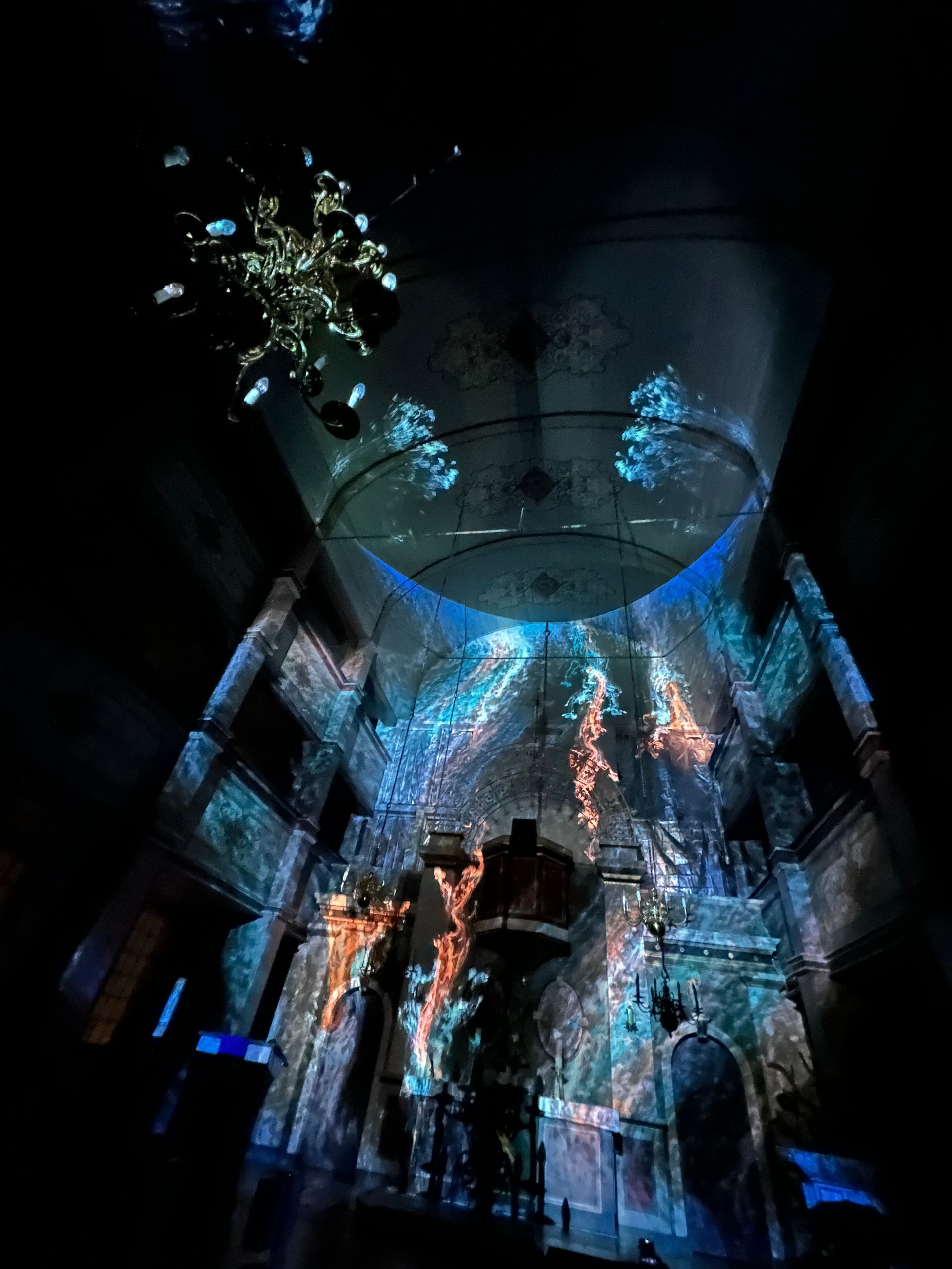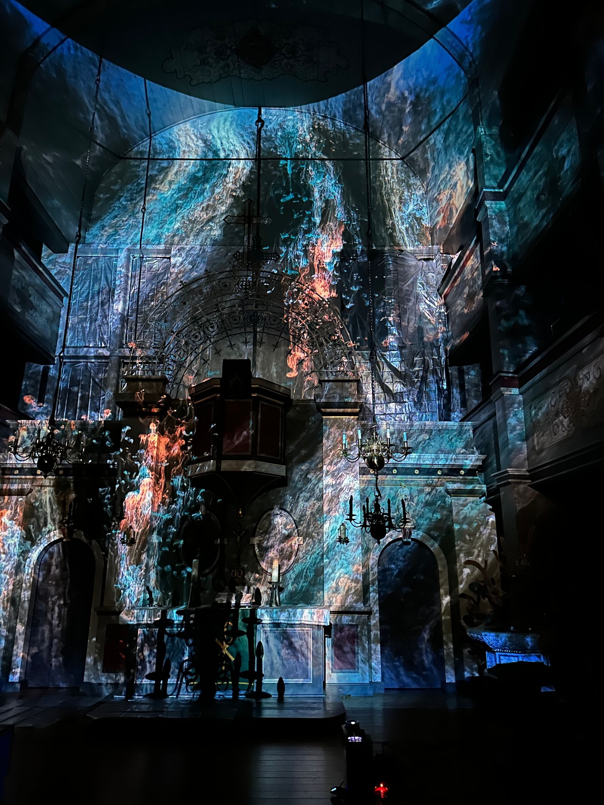Licht und Wasser sind die Grundlage des Lebens. Die Eigenschaften von Wasser, das natürliche Fließverhalten von in Wasser gelöster Tusche und die damit verbundenen Spuren und Formen, bilden die Grundlage der Videoinstallation. Zeichentusche, im Wasser der Schwerkraft folgend, breitet sich aus, Bewegungsspuren werden sichtbar als Videoprojektion auf den bespielten Flächen im Kirchenraum. Eine Dynamik entsprechend den Gesetzmäßigkeiten der Natur, sei es in Organismen, in der Pflanzenwelt, bei mikro- und makrokosmischen Prozessen oder in Lebenskreisläufen, bei denen Bewegung, Energie und Wachstum den Prozess der Formgebung bestimmen.