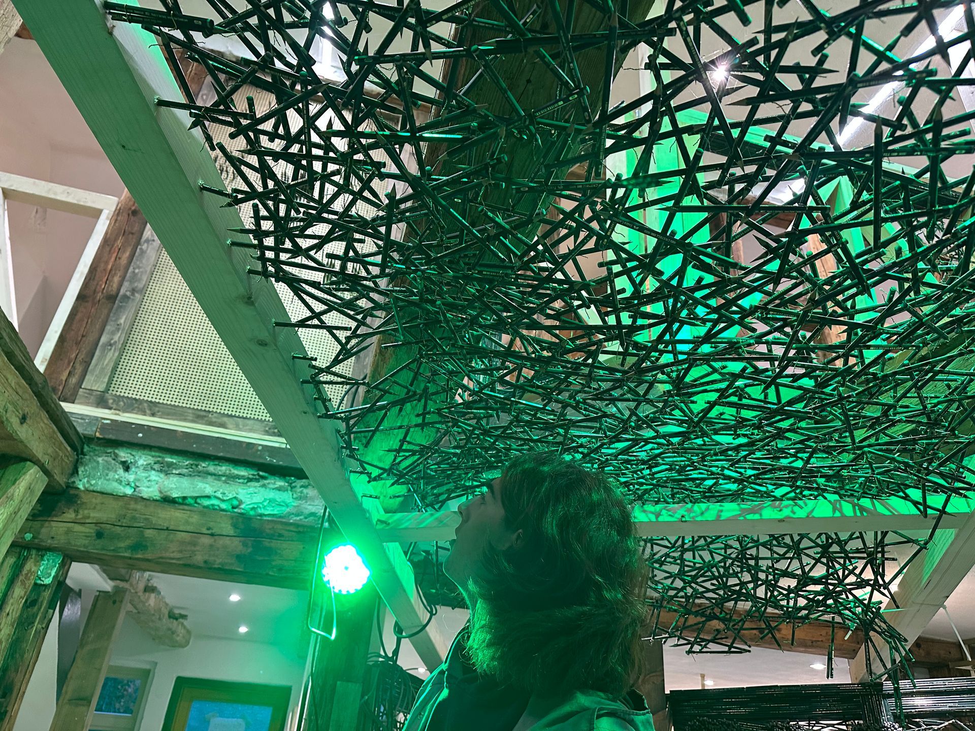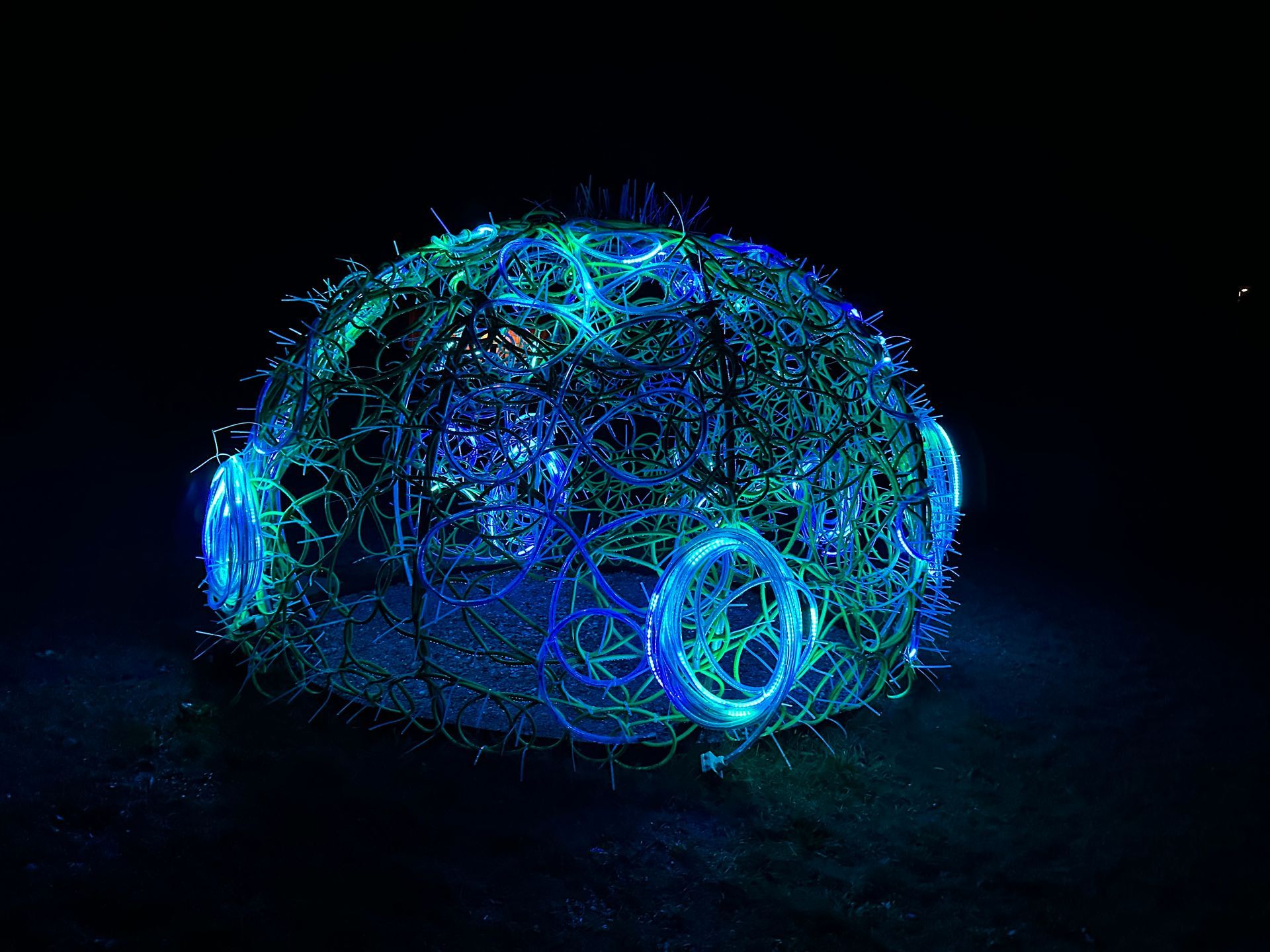 Lange, geschwungene Linien, wie der Lerbach selbst, tanzen von der Kuppel zum Boden und ergießen sich über die Wiese. Das Licht im Dunkeln wird zum kreativen Impuls, zum Anstoß, die eigene Vorstellungskraft zu beflügeln. Hier trifft man nicht nur auf Freunde, sondern vielleicht auch auf Fremde, die sich im Rahmen einer Schwarmkunstaktion miteinander verbinden und so zu neuen Verbindungen und gemeinsamer Kreativität finden. Dieses Werk ist ein lebendiges, sich ständig veränderndes Experiment, das den Dialog mit dem Publikum sucht und Platz für neue Ideen und Interpretationen lässt. Es lädt ein, Normen zu hinterfragen, umzudenken und das Unbekannte zu umarmen. Ein Ort der Begegnung – sowohl mit anderen als auch mit der eigenen Fantasie.